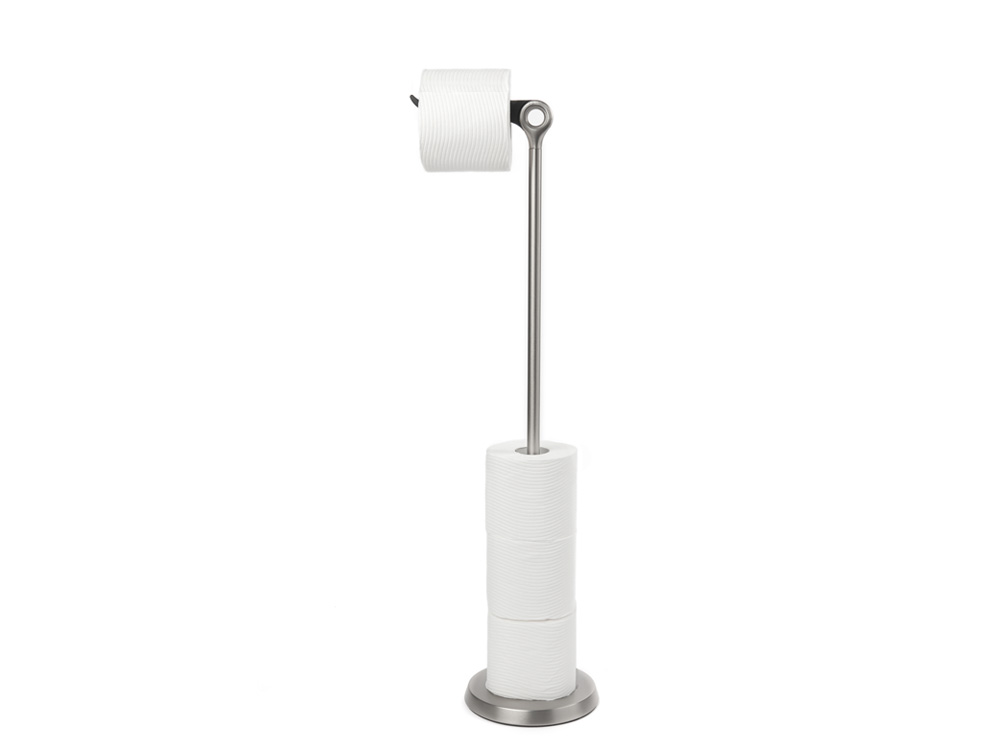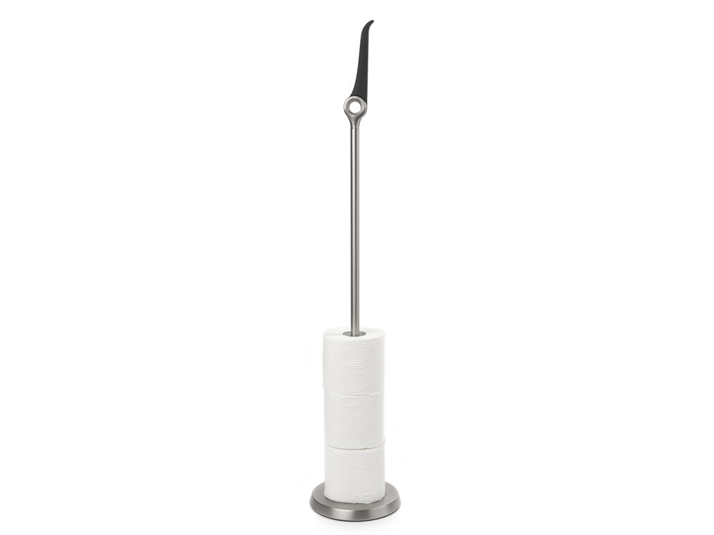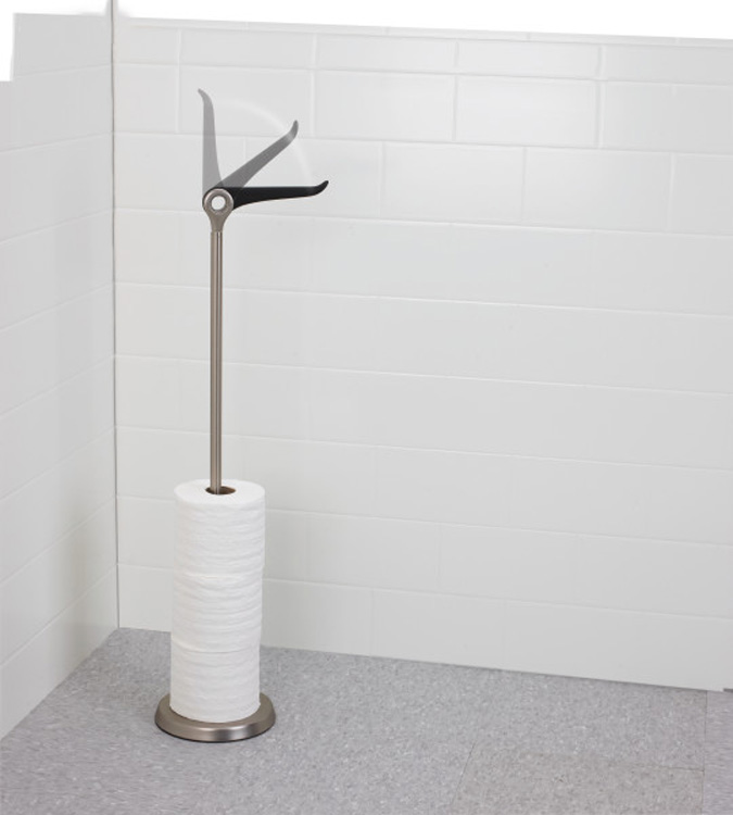 Elegancki podłogowy wolnostojący stojak na papier toaletowy i zapas papieru 2w1 z ruchomym stylizowanym chwytem na rolkę papieru przypominającą głowę ptaka.