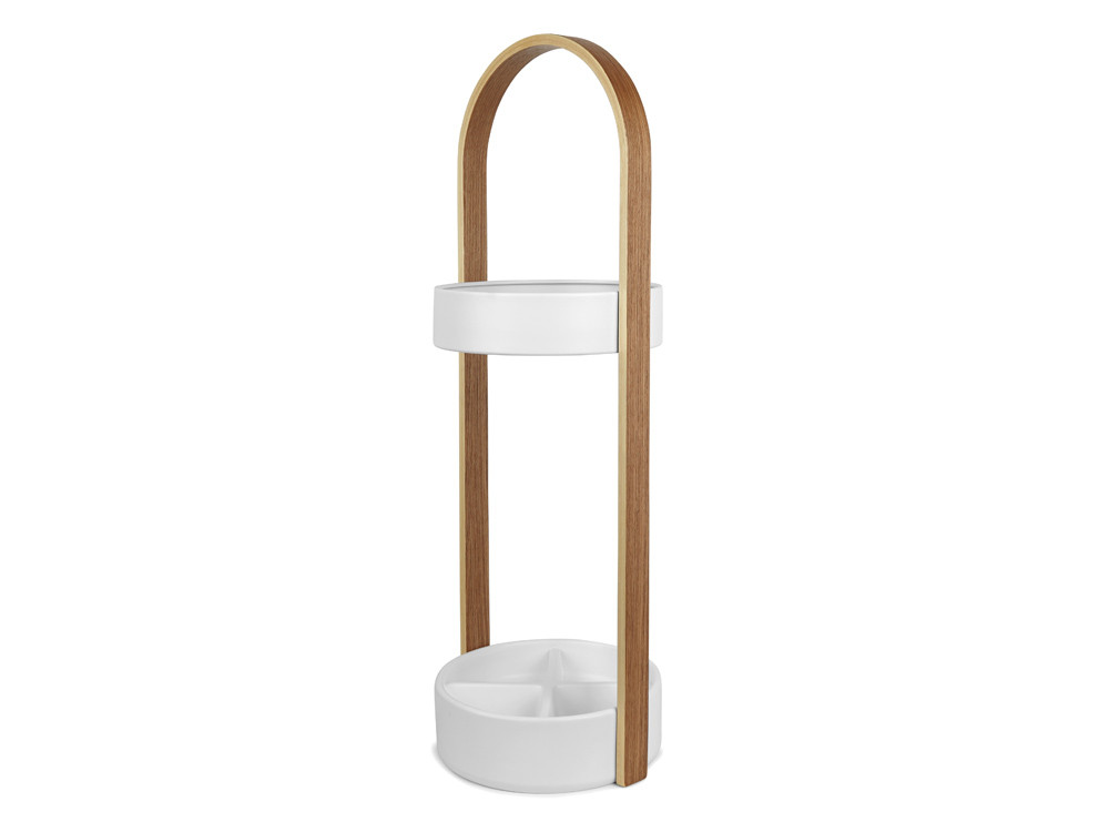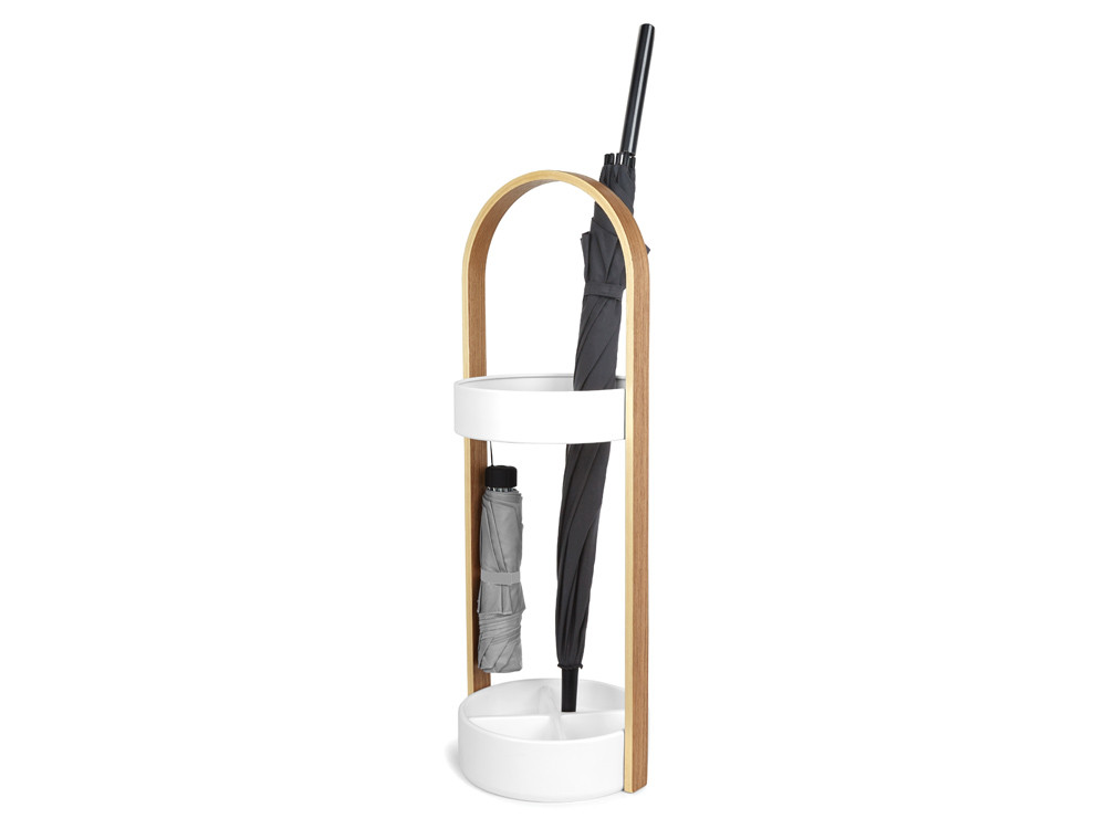 Oryginalny podłogowy wolnostojący stojak na parasole z okrągłą szczelną podstawą odporną na niekorzystne działanie wody. Stojak z elementami metalowymi w kolorze białym oraz drewnianym giętym uchwytem w kolorze naturalnego drewna.