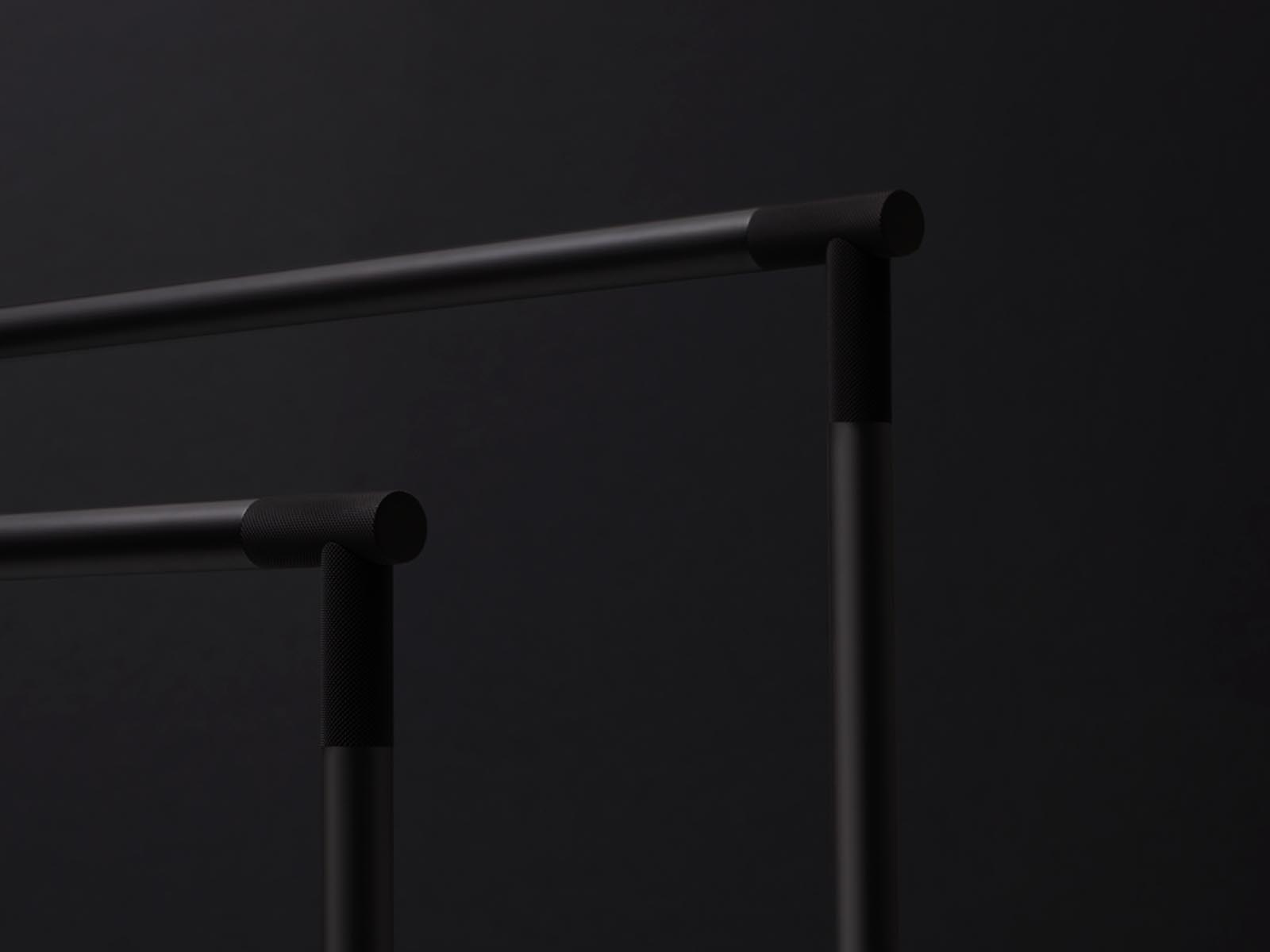 Stojak posiada dwa ramiona z szerokimi poprzeczkami umieszczonymi na różnych wysokościach, narożniki ramion stojaka ozdobione charakterystyczną strukturalną powierzchnią.