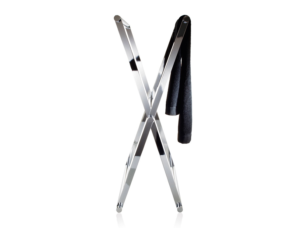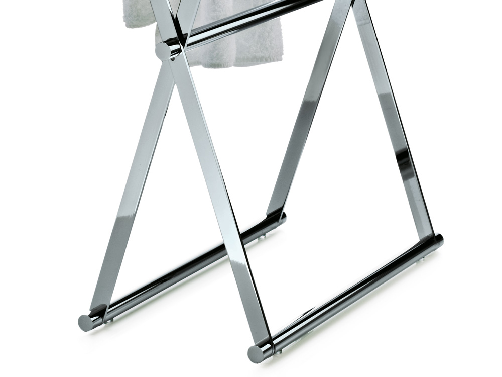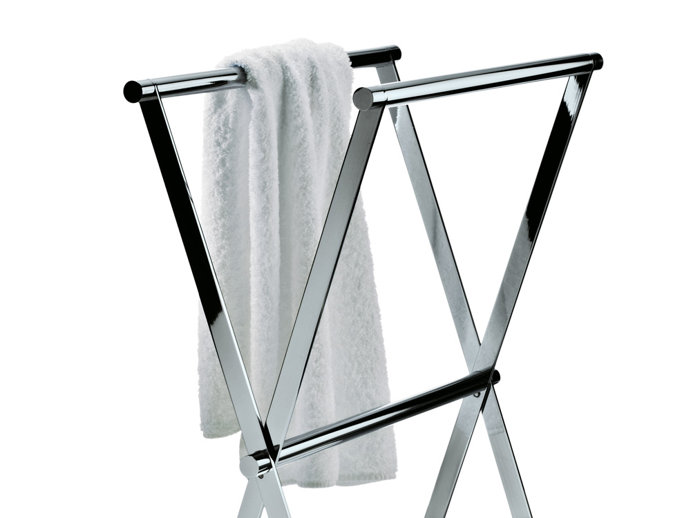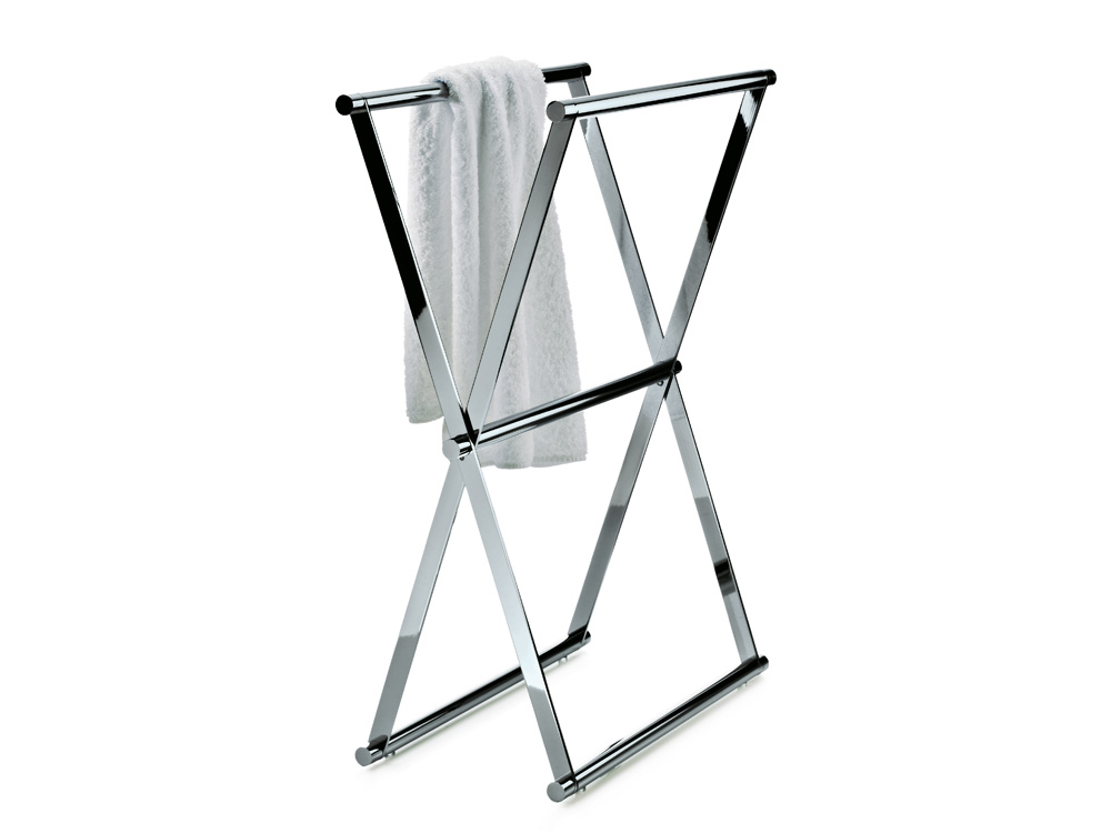 Duży elegancki wolnostojący stojak na ręczniki o krzyżowej składanej konstrukcji.