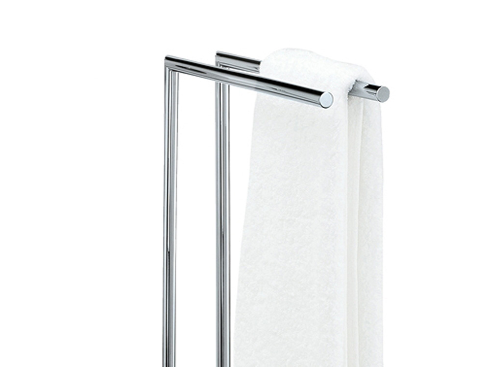 Elegancki podłogowy wolnostojący stojak na ręczniki z dwoma jednopoziomowymi ramionami.