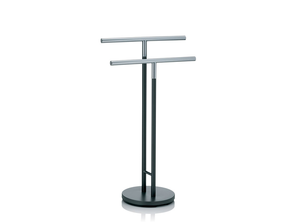 Stojak Seven to elegancki dwuramienny stojak łazienkowy na ręczniki wykonany z chromowanego metalu, a częściowo pokryty emalią w kolorze antracytowym. Stojak jest utrzymany w nowoczesnej prostej stylizacji w kształcie dwóch literek T.
