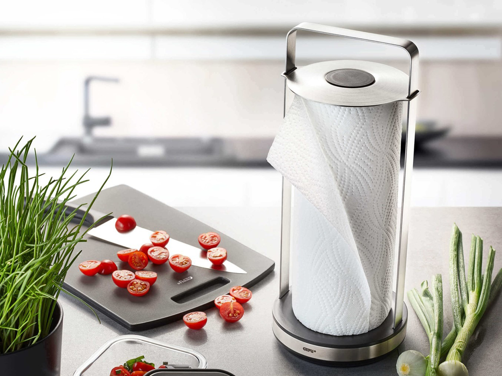 Stojak na ręczniki papierowe Smartline to praktyczny i stylowy dodatek, który doskonale sprawdzi się w nowoczesnej kuchni. Stabilna konstrukcja zapobiega przewracaniu się i ślizganiu po powierzchni, co umożliwia wygodne użytkowanie nawet jedną ręką. Dzięki swojemu designerskiemu wyglądowi, Smartline nie tylko ułatwia codzienne czynności, ale także stanowi elegancką ozdobę kuchni. Wyposażony w dwustronną krawędź do odrywania i wbudowany obciążnik, zapewnia stabilność i kontrolę nad rozwijaniem się papieru. Jest kompatybilny z ręcznikami o średnicy do 12,5 cm i zawiera jedną rolkę papieru w zestawie.