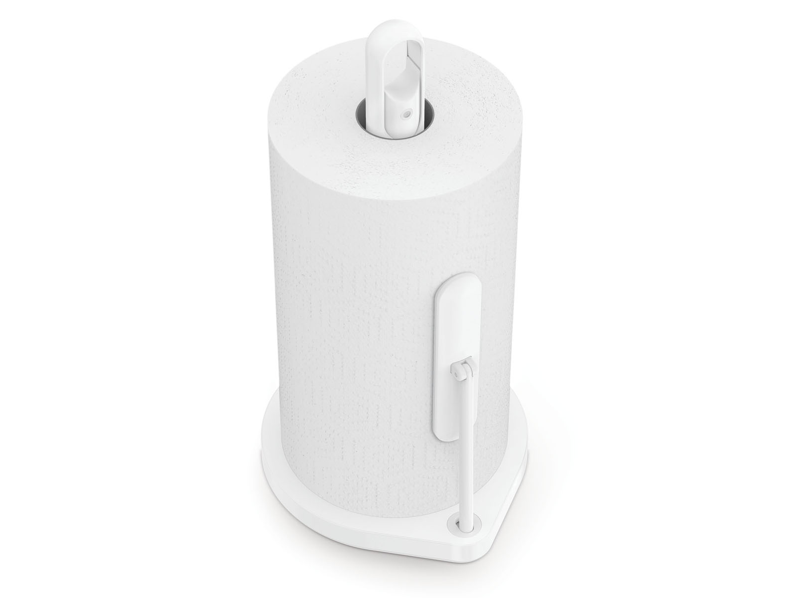 Oryginalny i funkcjonalny stojak na ręczniczki papierowe z solidną podstawą wyposażoną w sprężynujące ramię dociskowe oraz mobilny spryskiwacz do płynu czyszczącego.