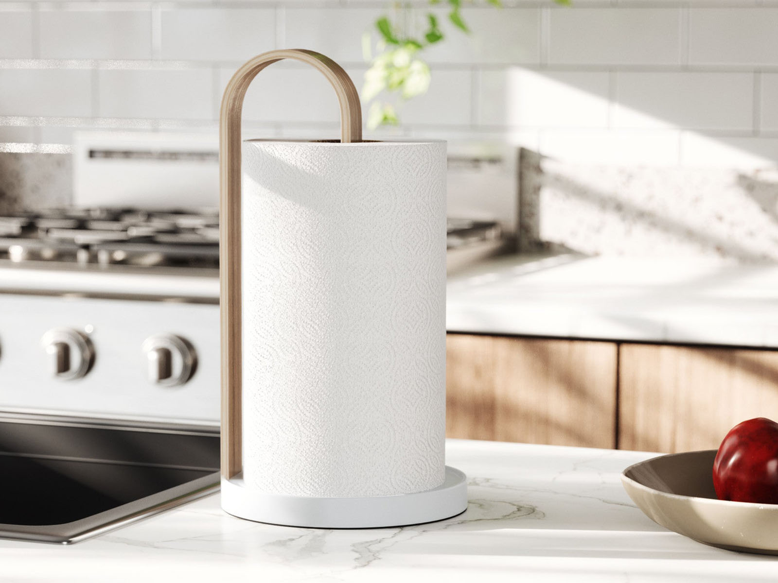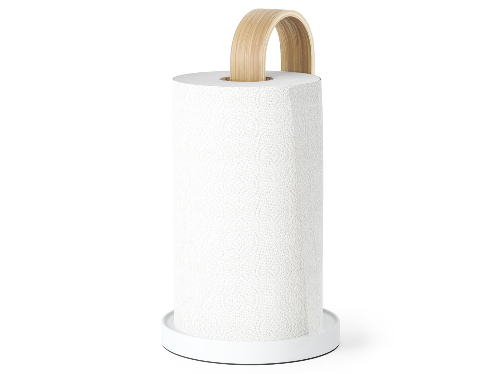 Stojak na ręczniki papierowe Bellwood świetnie wpisuje się w stylistykę kolekcji - posiada okrągłą metalową podstawę oraz ramię z giętego drewna utrzymujące w pionie rolkę ręczników papierowych. Ciężar podstawy pozawala na odrywanie arkuszy jedną ręką bez przytrzymywania stojaka.