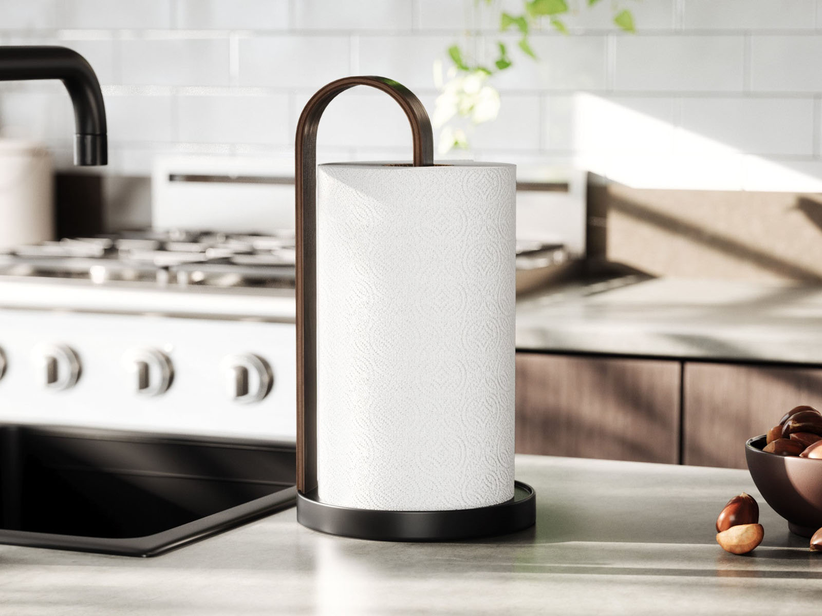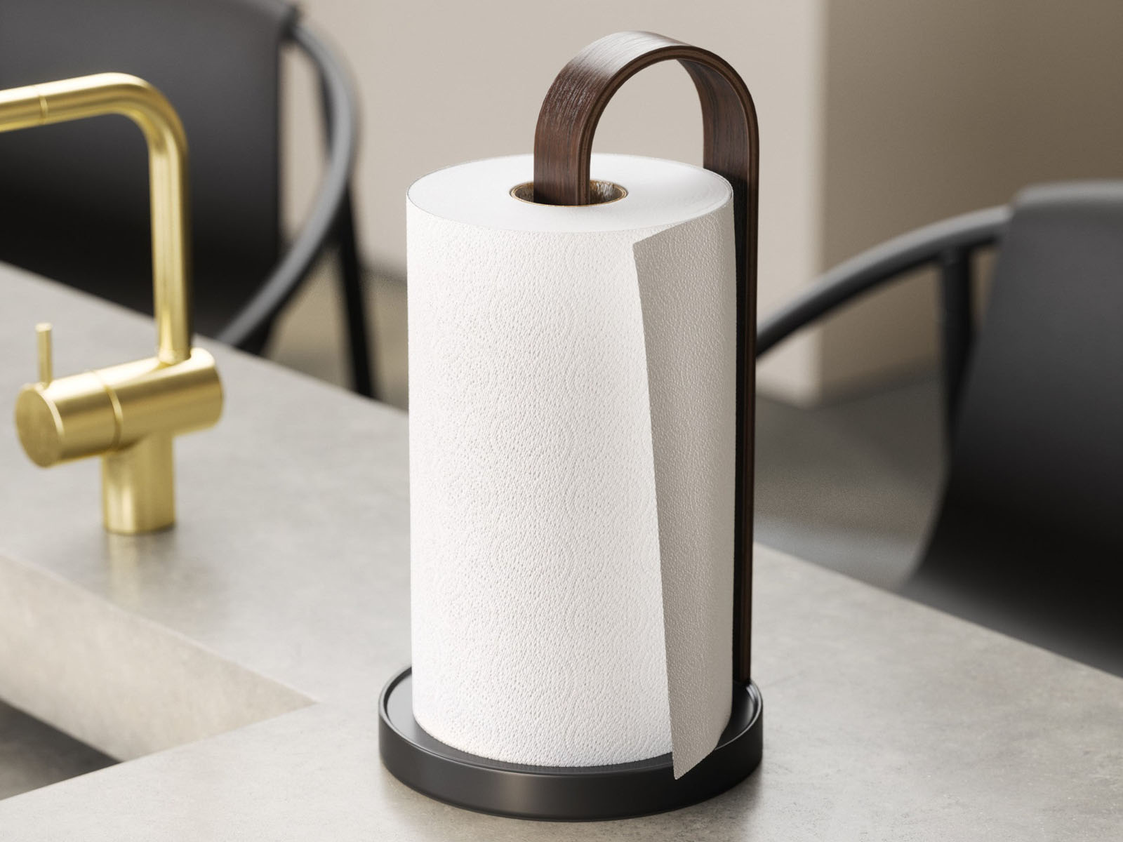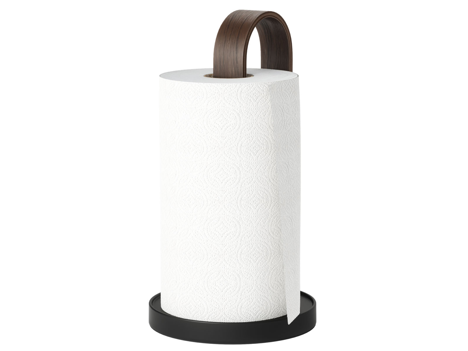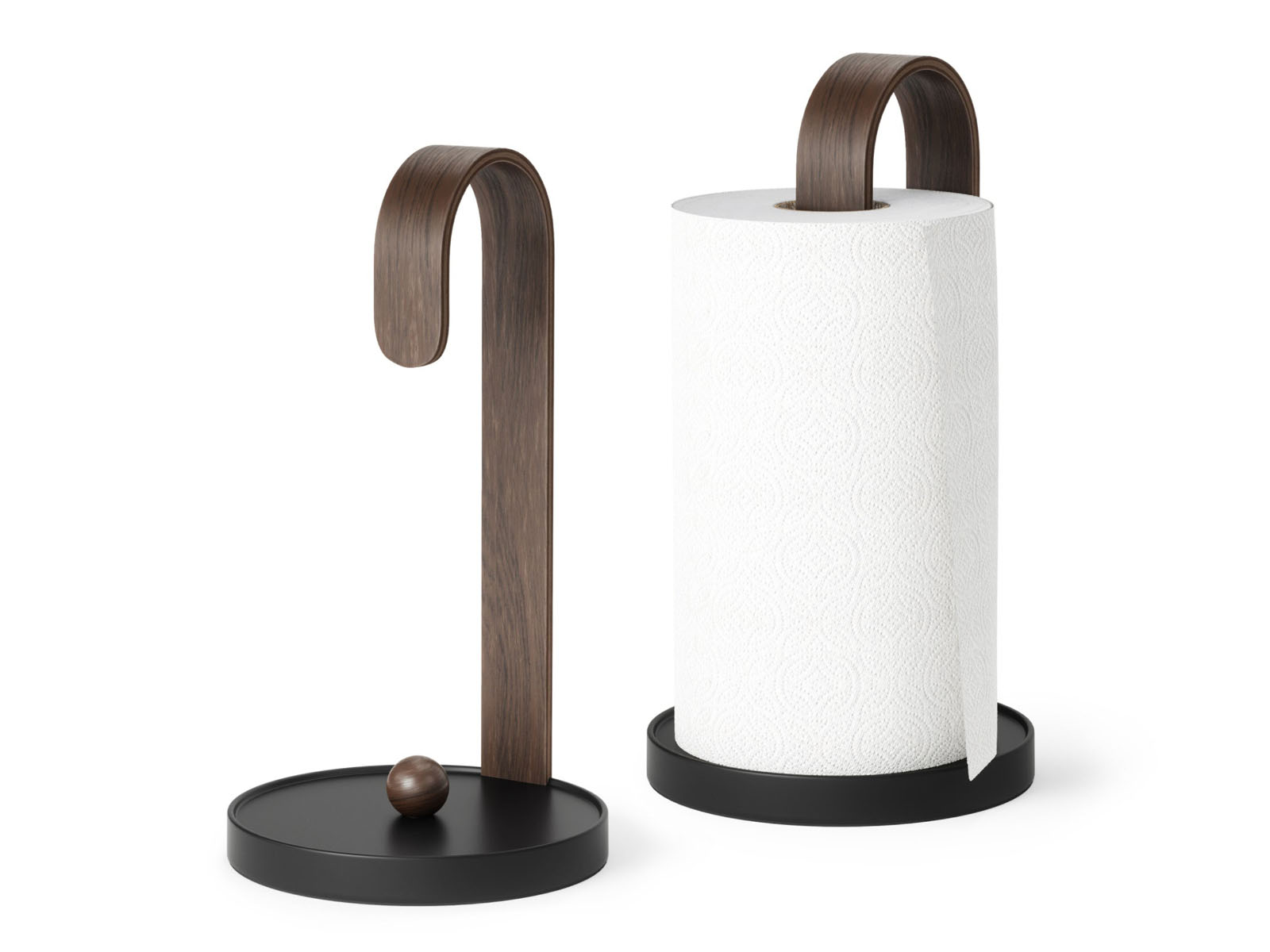 Stojak na ręczniki papierowe Bellwood świetnie wpisuje się w stylistykę kolekcji - posiada okrągłą metalową podstawę oraz ramię z giętego drewna utrzymujące w pionie rolkę ręczników papierowych. Ciężar podstawy pozawala na odrywanie arkuszy jedną ręką bez przytrzymywania stojaka.