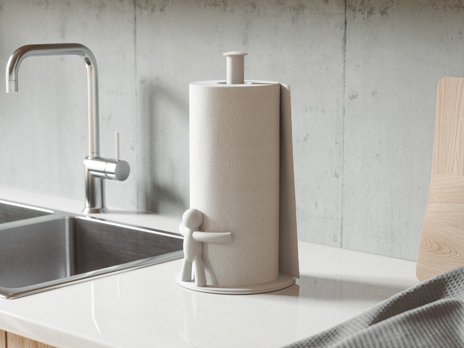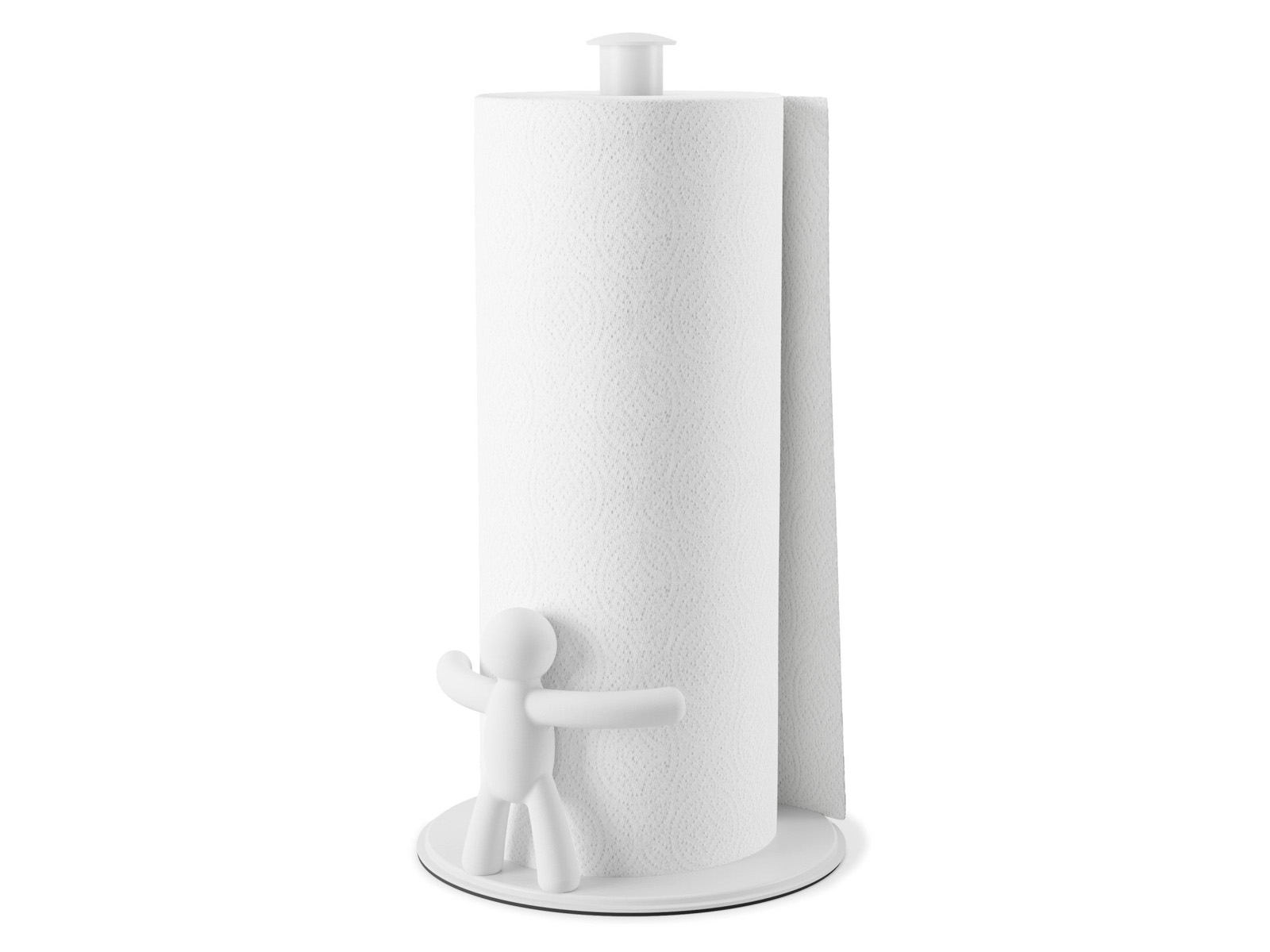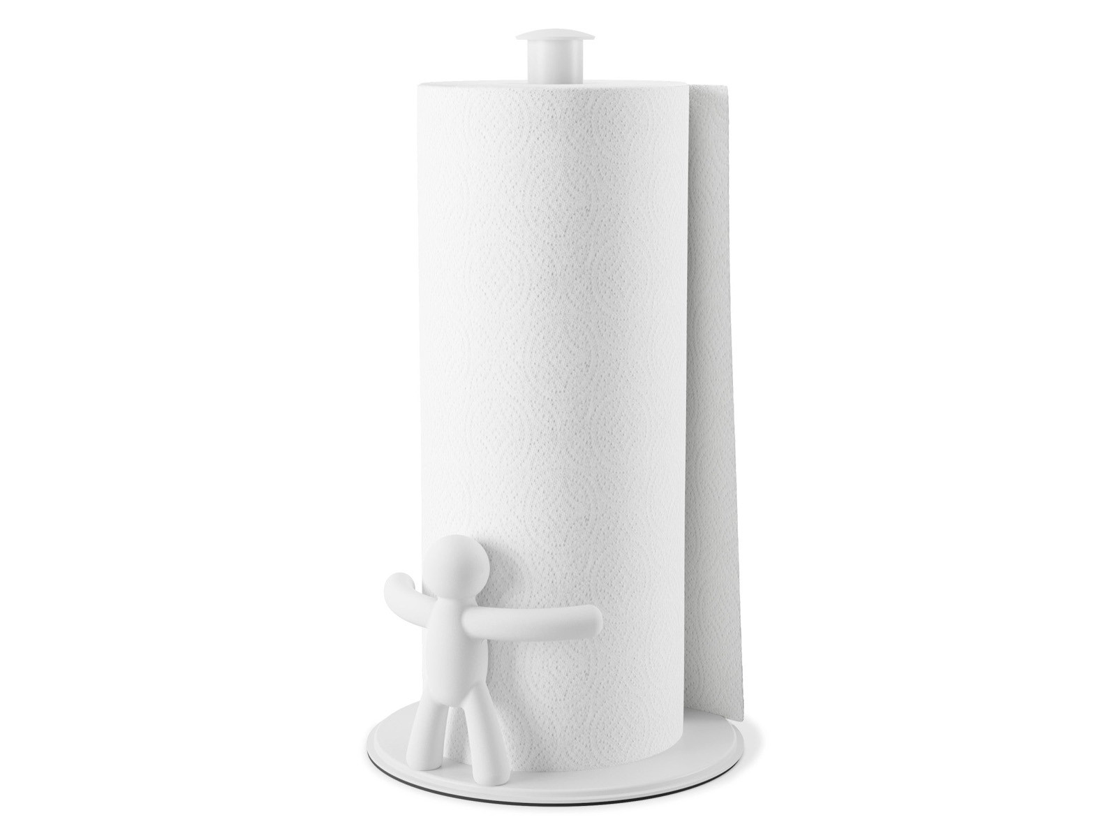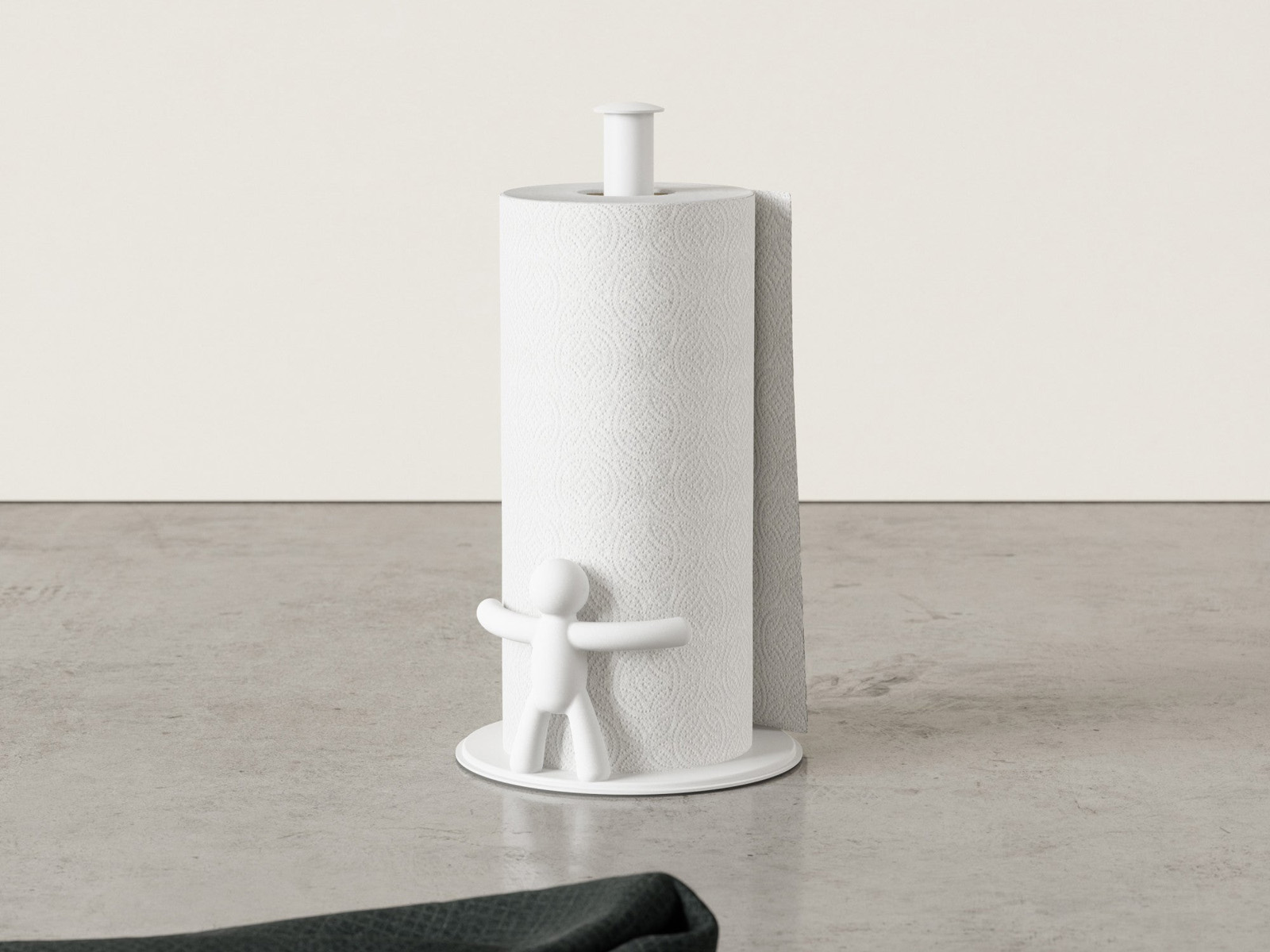 Oryginalny stojak na ręczniczki papierowe w rolce z metalową podstawą ozdobiony miniaturką "ludzika" z tworzywa sztucznego, który próbuje objąć rolkę papieru rozłożonymi ramionami.