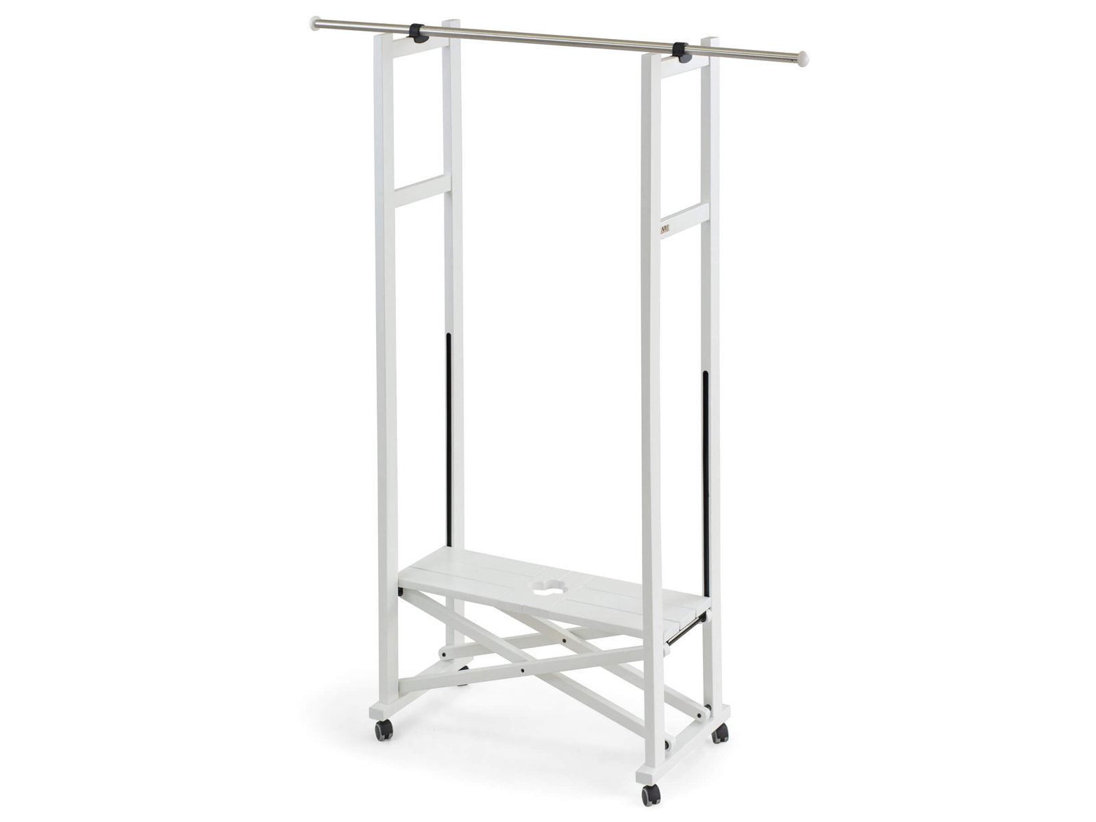Stylowy, składany stojak na ubrania, buty i garnitury z drewnianą konstrukcją i kółkami
