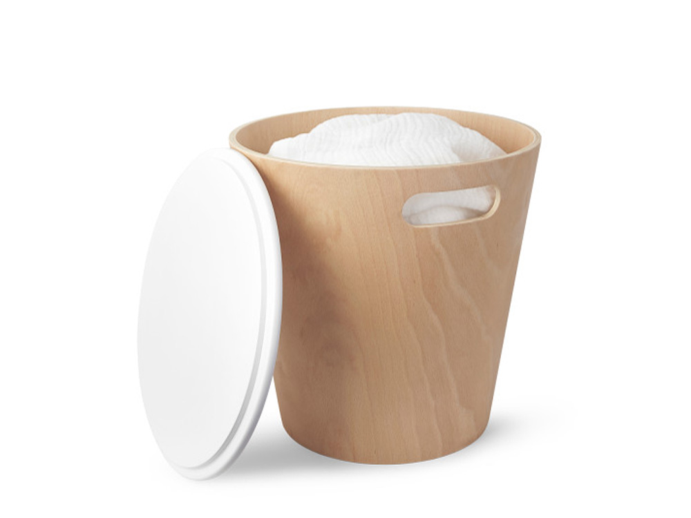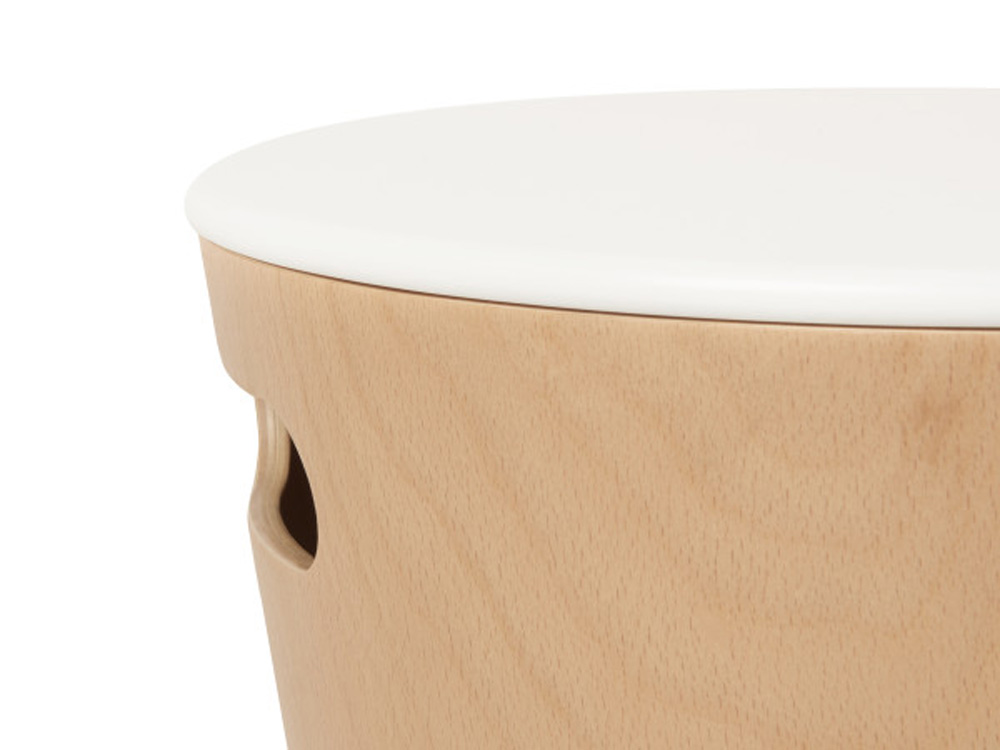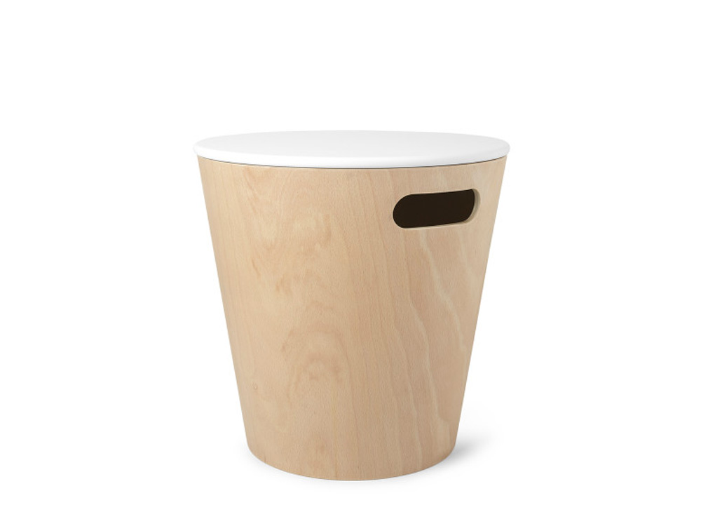 Powierzchnia pojemnika w naturalnym wykończeniu drewnianym z widoczną strukturą drewna, pokrywa stołka zdejmowana o jednolitym kolorze.