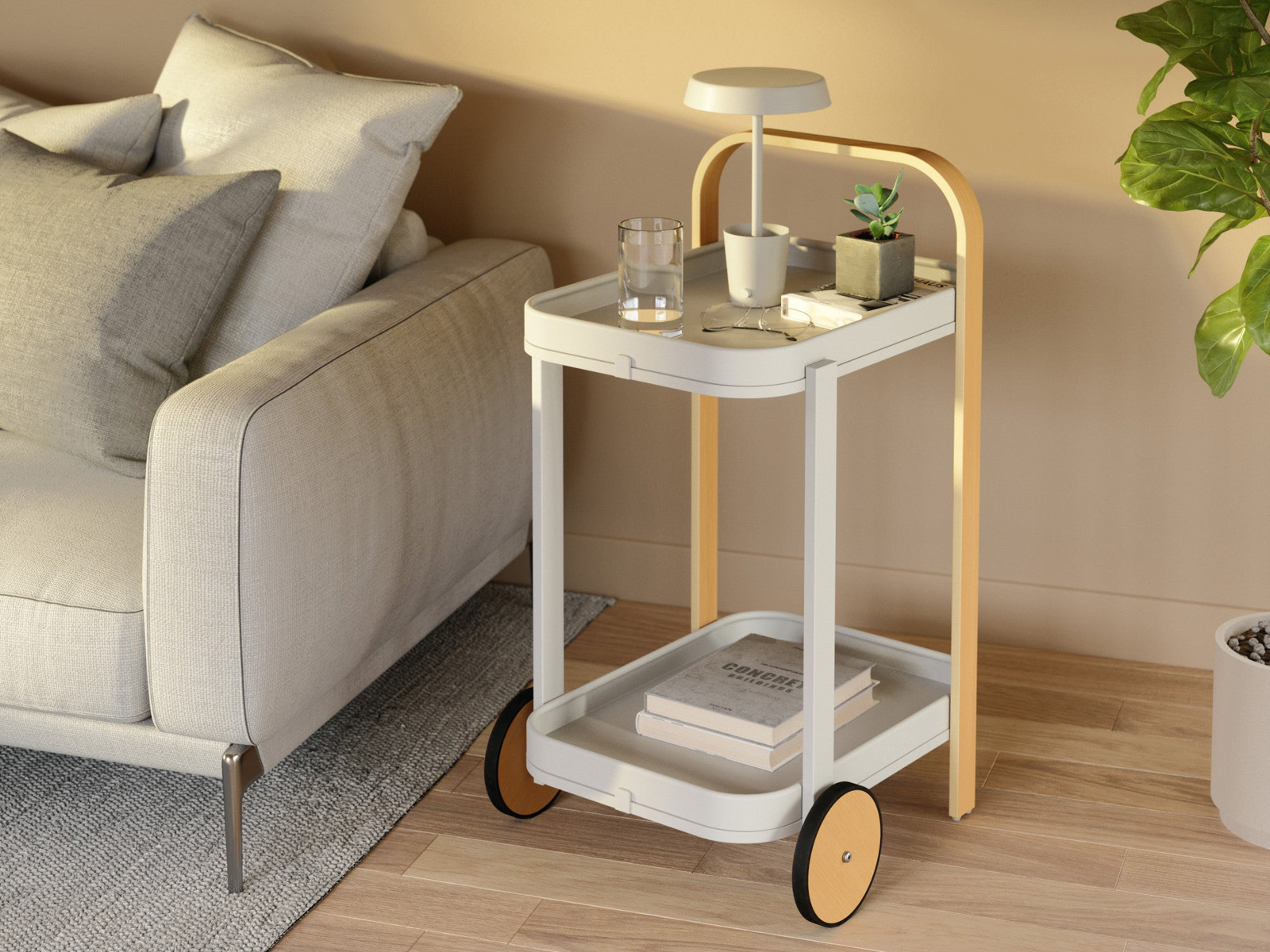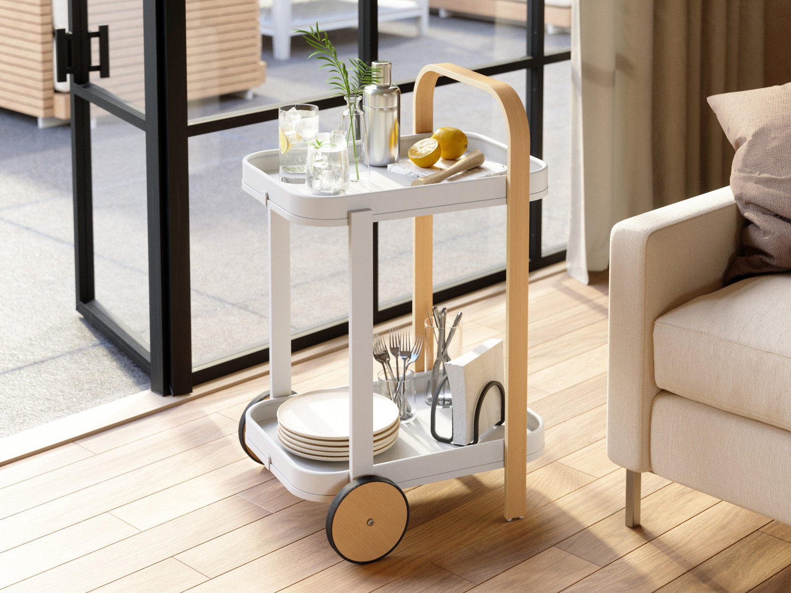 Przesuwanie stolika umożliwiają 2 duże drewniane otoczone gumą koła oraz wygodny szeroki uchwyt wykonany z giętego drewna.