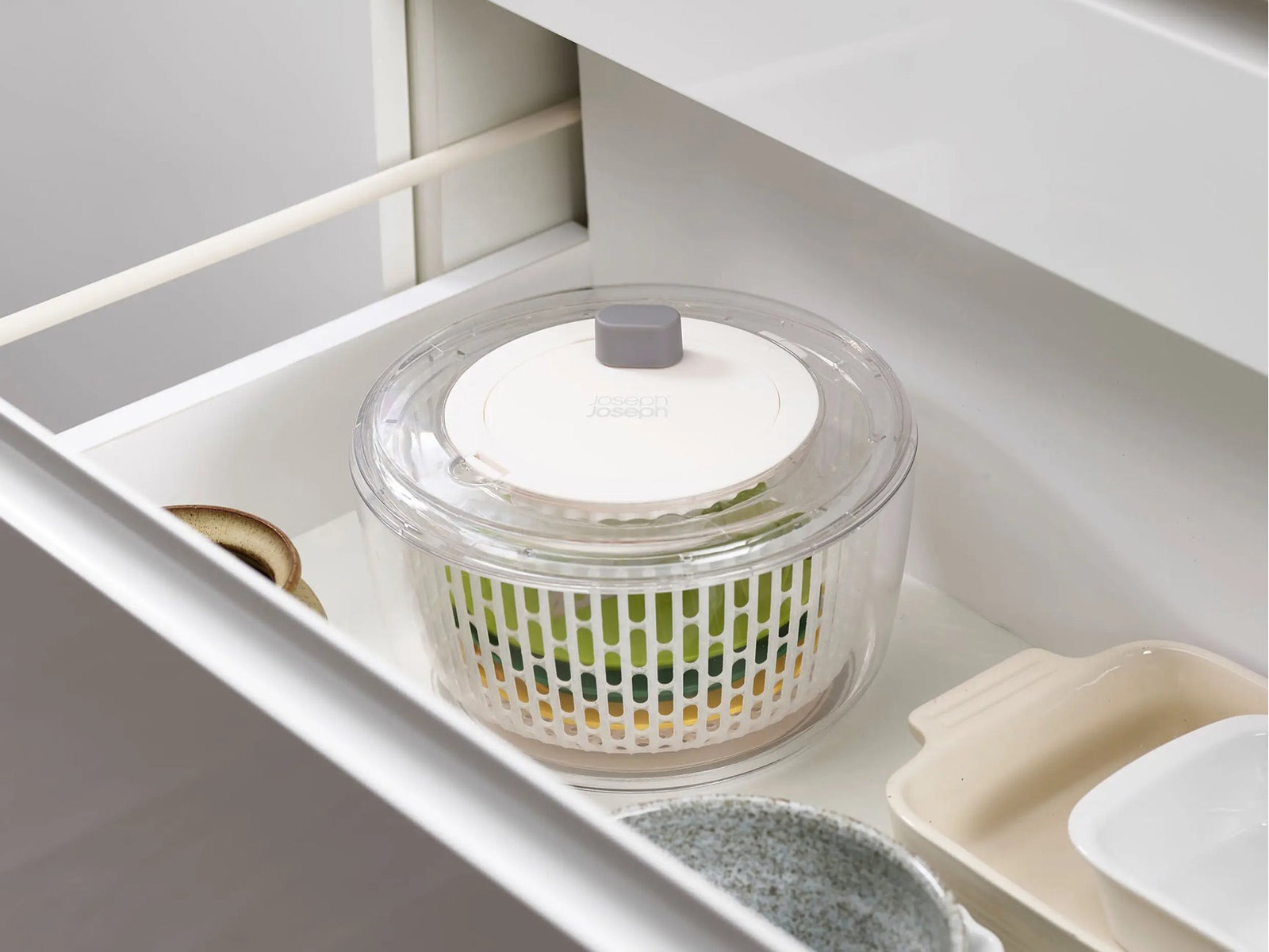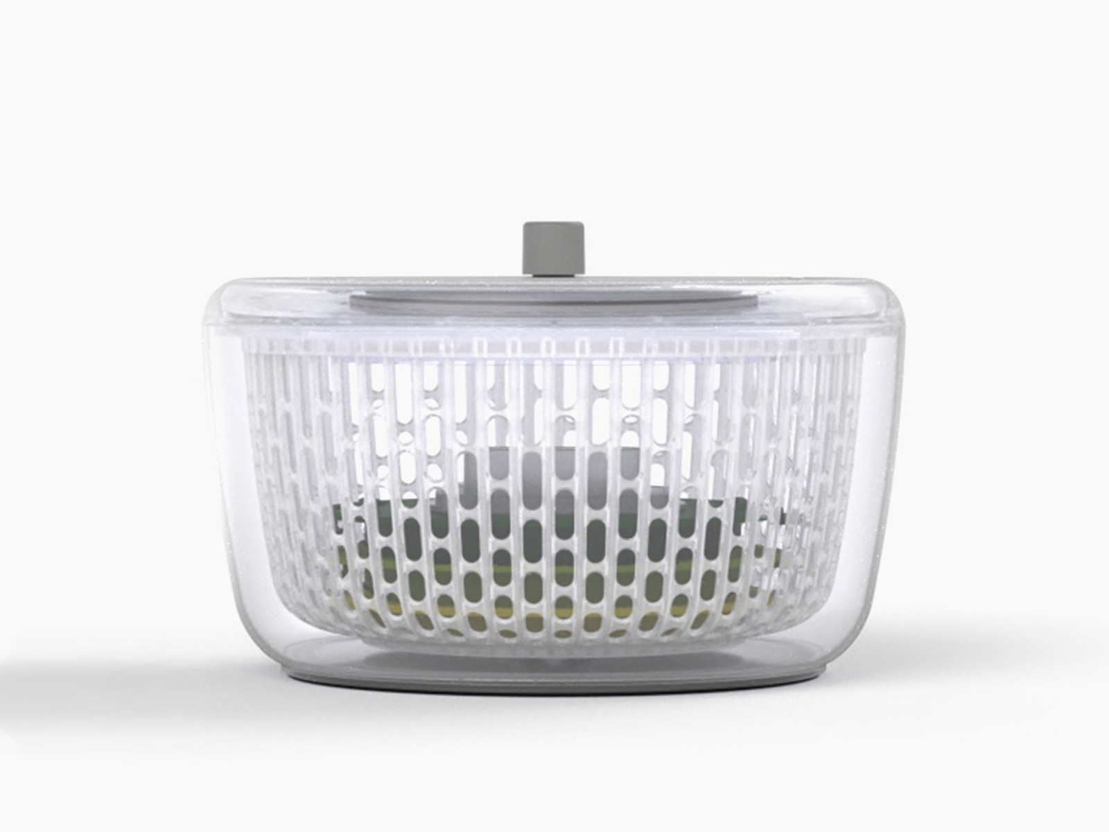 W zestawie znajduje się koszyczek o wysokich ażurowych bokach do odsączania sałaty oraz osłonka palców zapewniająca bezpieczne krojenie i spiralizowanie warzyw.