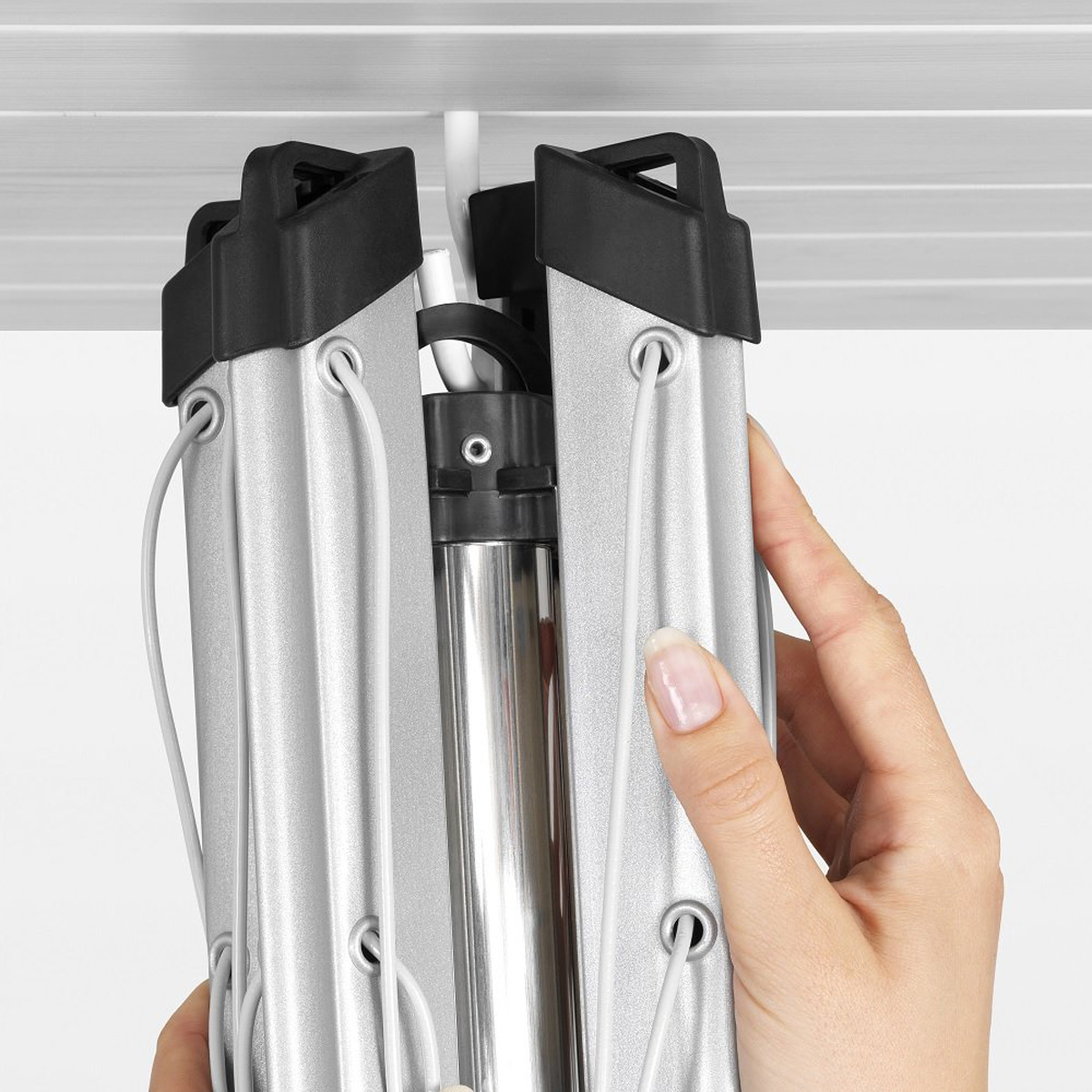 Po wyjęciu z tulei i złożeniu suszarka zajmuje bardzo niewiele miejsca, wytrzymały zaczep umożliwia przechowywanie jej w pozycji wiszącej.