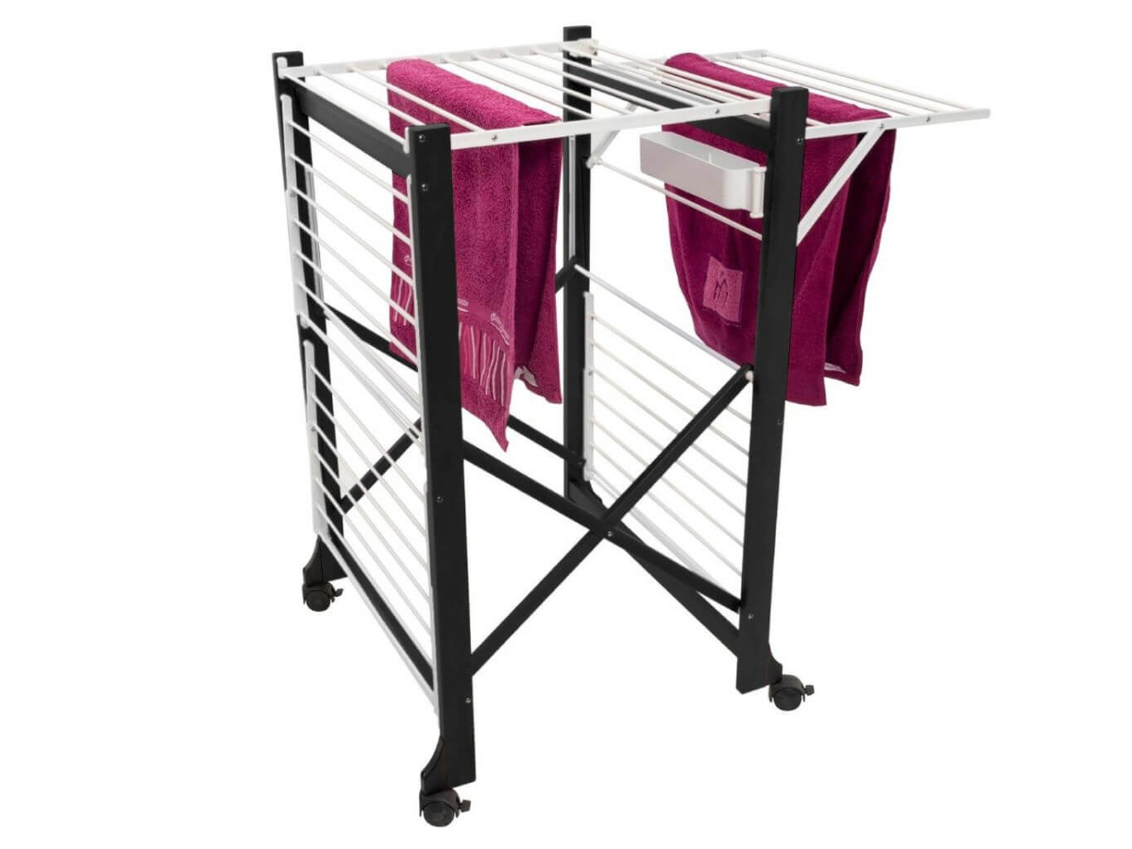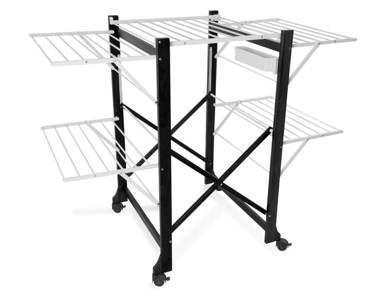 Funkcjonalna suszarka na pranie z drewnianą konstrukcją i kółkami