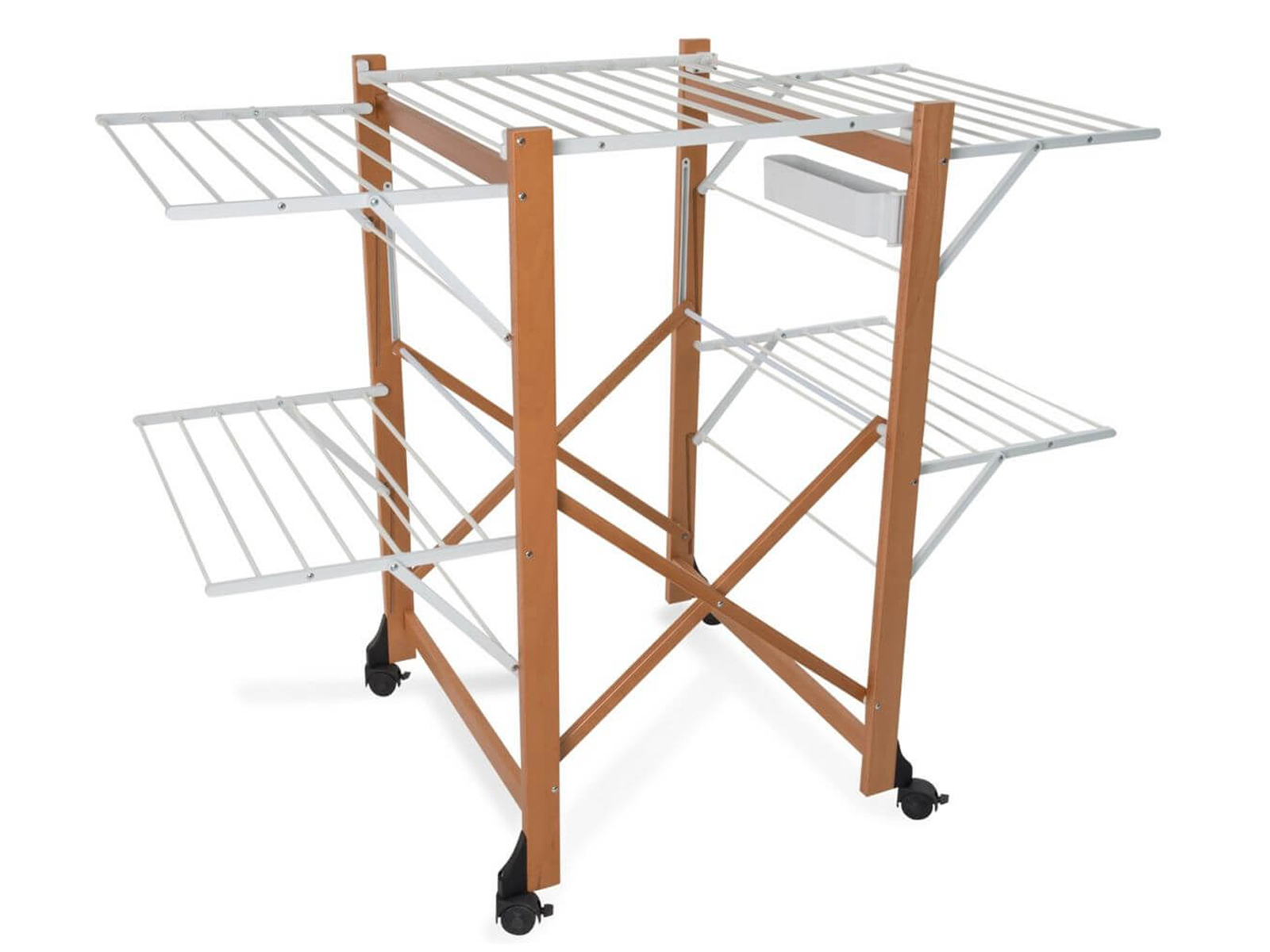 Funkcjonalna suszarka na pranie z drewnianą konstrukcją i kółkami