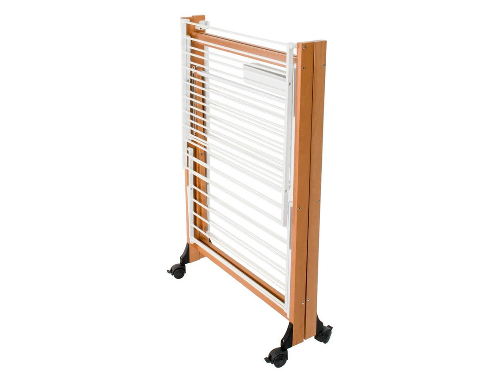 Naścienne i podłogowe suszarki Arredamenti oferują ciekawe rozwiązania w suszeniu prania dzięki pomysłowym, drewnianym konstrukcjom. Suszarka Aliante umożliwia rozwieszanie ubrań na 2 poziomach, które stanowią razem aż 23 metry powierzchni do wykorzystania. Wykonana z litego drewna bukowego i z drutów powlekanych aluminium, zapewnia stabilność na nierównej powierzchni, a także odporność na zużycie. Obrotowe, gumowe kółka z blokadą sprawiają, że suszarkę można łatwo przemieszczać i ustawiać w dowolnym miejscu. Prosty system składania oraz kompaktowe wymiary po złożeniu pomagają w oszczędzaniu wolnej przestrzeni. Dodatkowym atutem jest obrotowy pojemnik na spinacze.