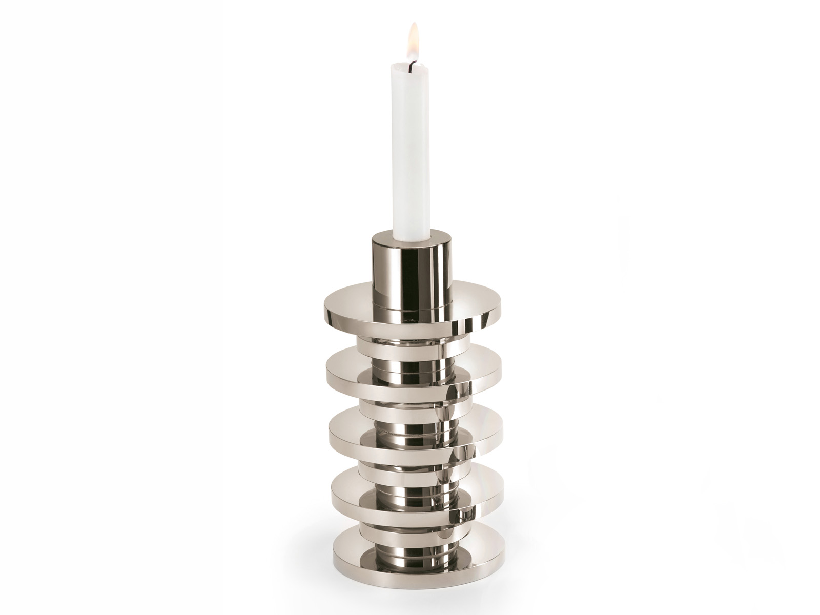 Elegancki duży pojedynczy świecznik o futurystycznym cylindrycznym kształcie, nadającym mu niepowtarzalnego industrialnego stylu w klimacie loftów starych budynków fabrycznych.