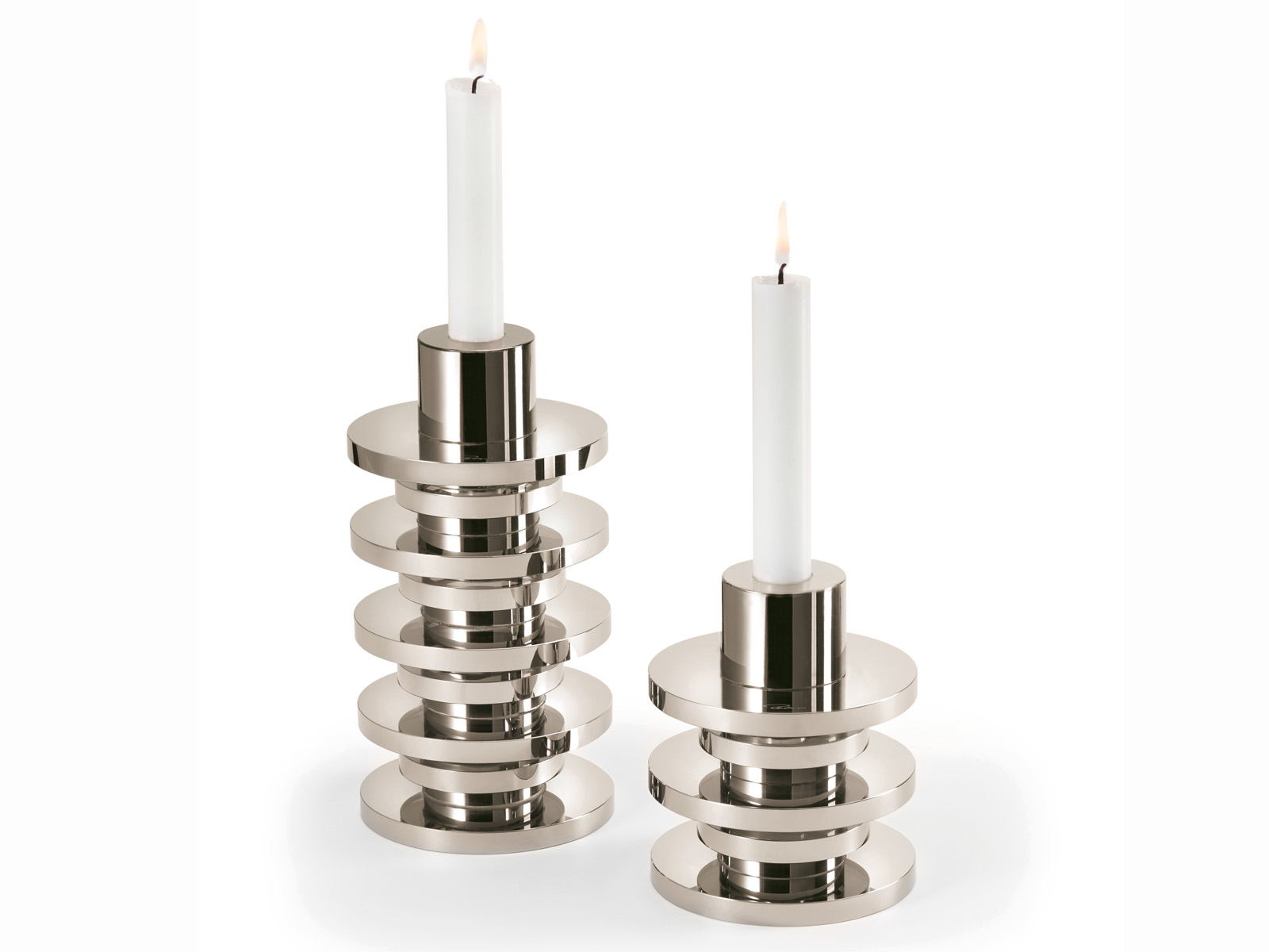 Konstrukcja świecznika w formie kompozycji różnej wielkości pierścieni, wykonana z bezołowiowego szkła kryształowego pokrytego powłoką tytanową.