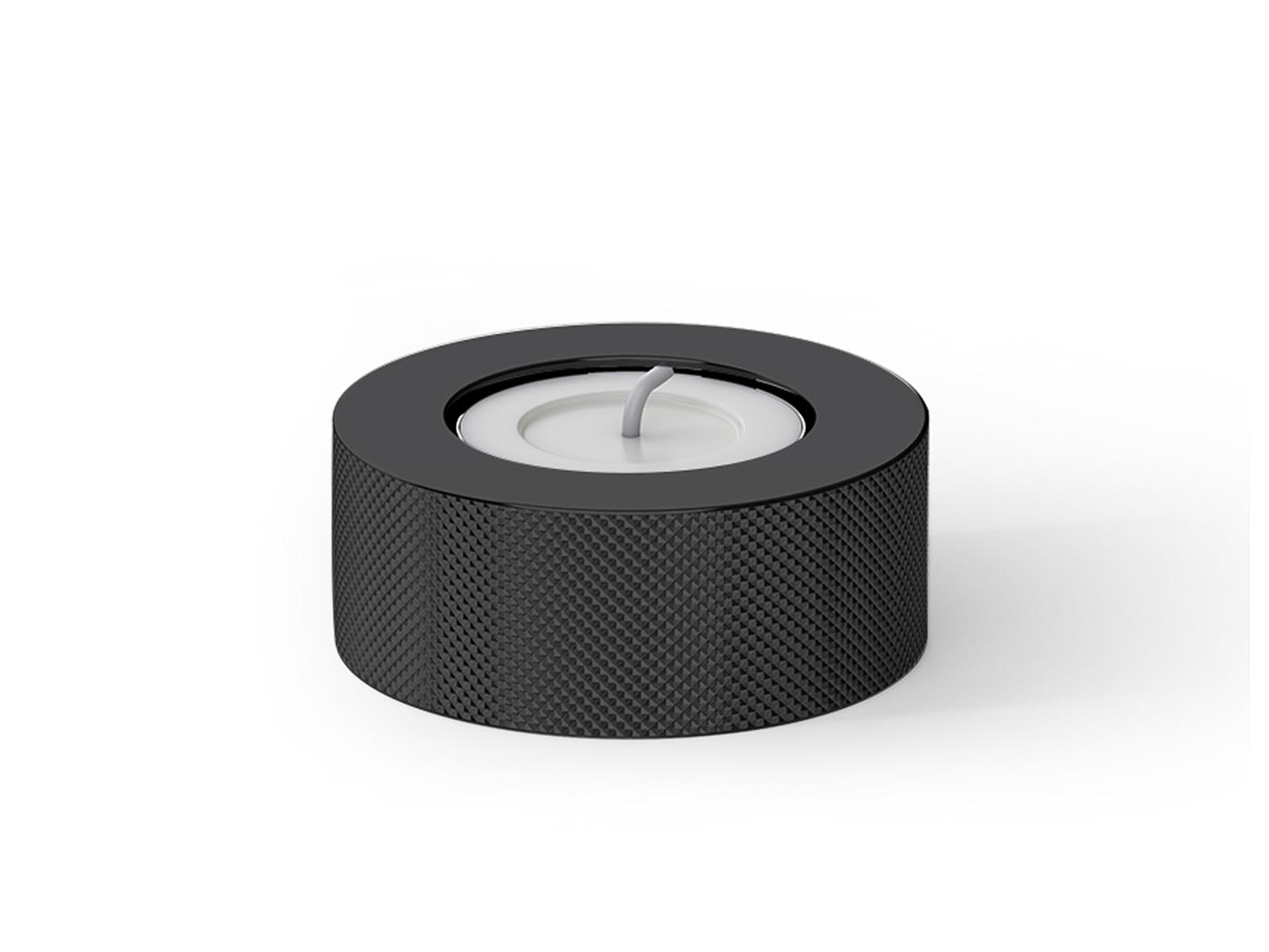Elegancki okrągły nablatowy świecznik wykonany z wysokiej jakości lakierowanego mosiądzu w wykończeniu matowym z bokiem ozdobionym pasem o charakterystycznej strukturalnej powierzchni.
