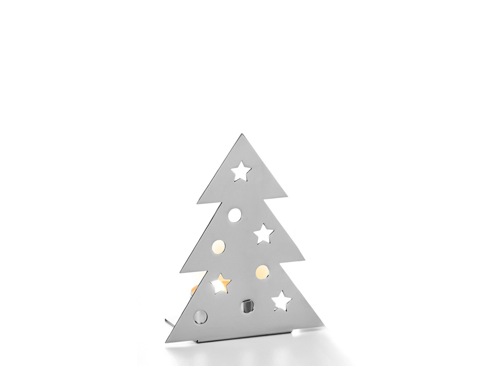 Świecznik uformowany z cienkiego arkusza stali nierdzewnej polerowanej na wysoki połysk z wyciętymi otworami w kształcie ozdób choinkowych oraz wygiętą do tyłu podstawą z uchwytem na świeczkę.