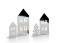 Świecznik uformowany z cienkiego arkusza stali nierdzewnej polerowanej na wysoki połysk z wyciętymi otworami okien oraz wygiętą do tyłu podstawą z uchwytem na świeczkę.