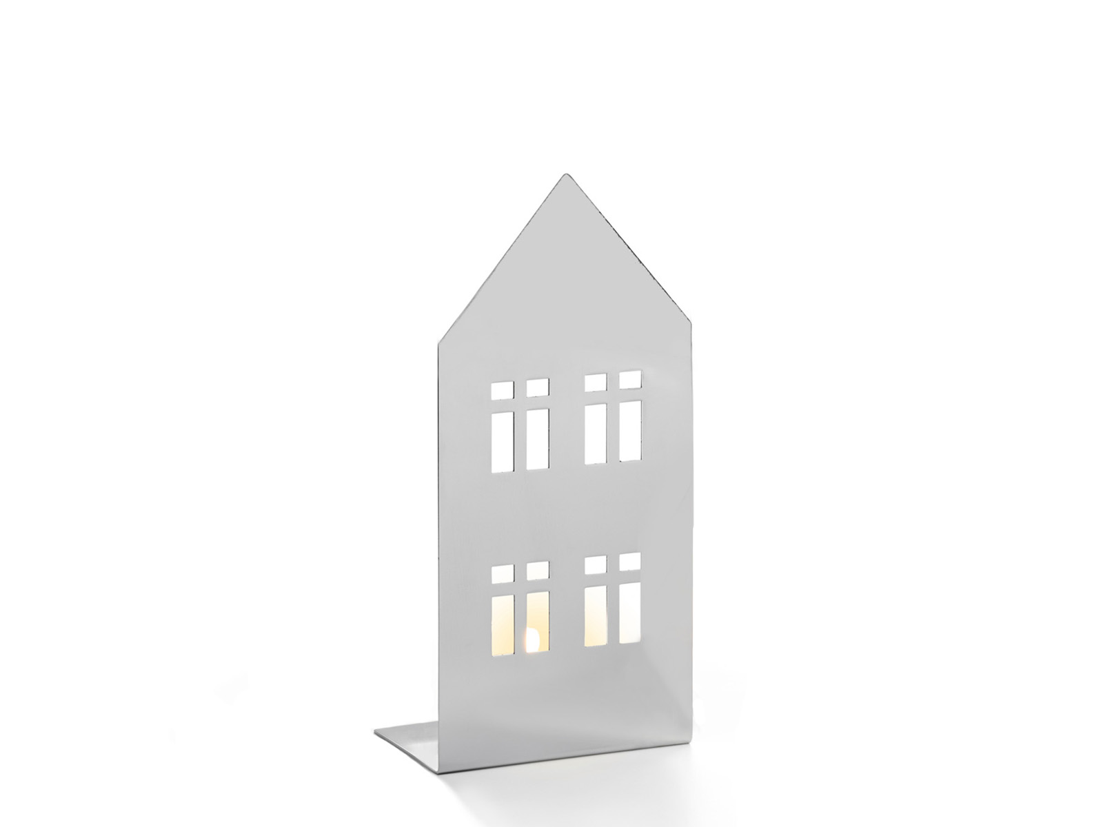 Świecznik uformowany z cienkiego arkusza stali nierdzewnej polerowanej na wysoki połysk z wyciętymi otworami okien oraz wygiętą do tyłu podstawą z uchwytem na świeczkę.