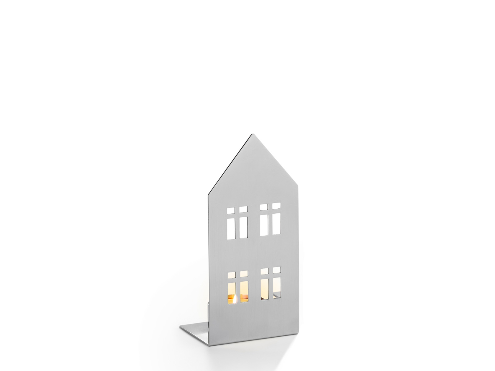 Świecznik uformowany z cienkiego arkusza stali nierdzewnej polerowanej na wysoki połysk z wyciętymi otworami okien oraz wygiętą do tyłu podstawą z uchwytem na świeczkę.
