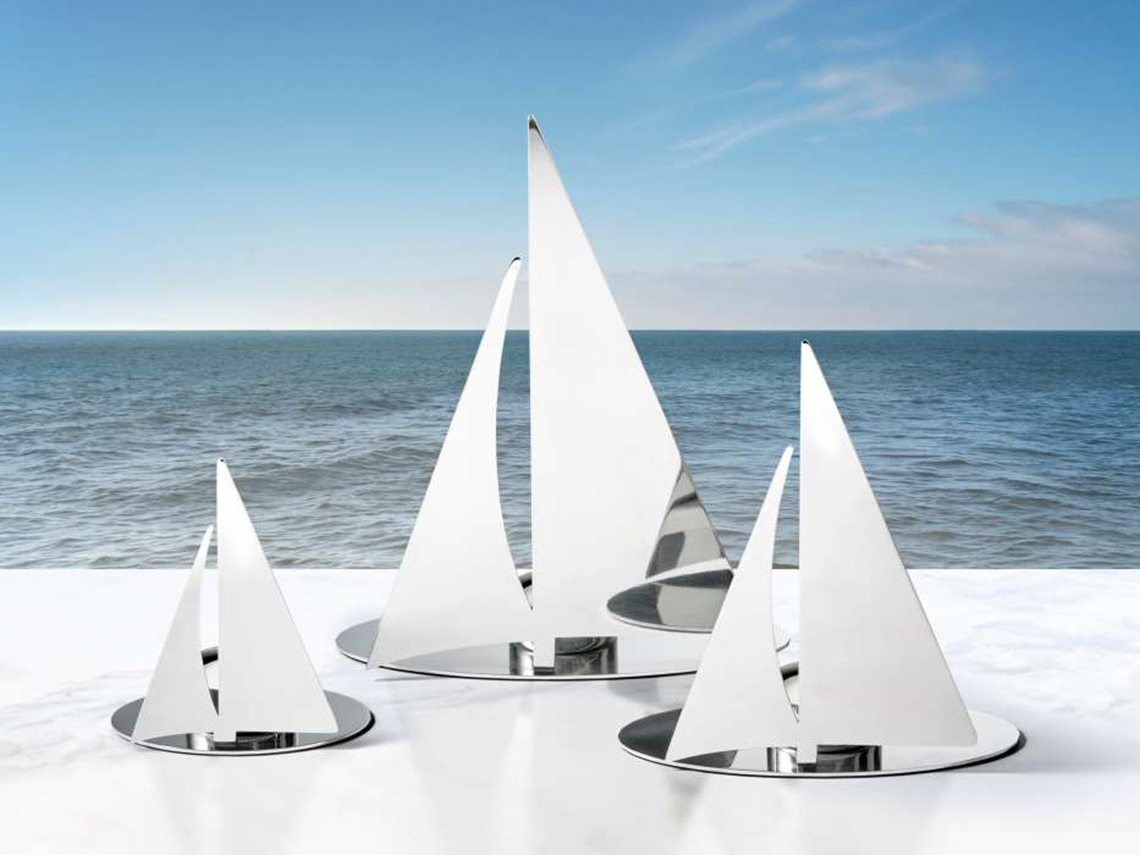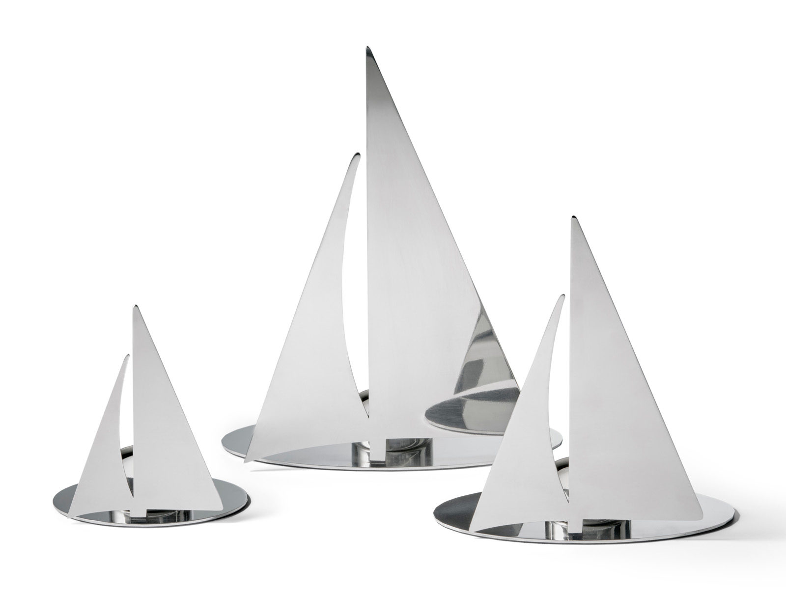 Świecznik w kształcie żaglówki z podwójnym żaglem osadzonym na owalnej stabilnej podstawie, wykonany ze stali nierdzewnej polerowanej na wysoki połysk.