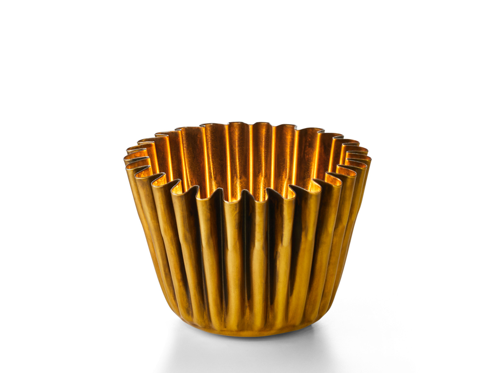Świecznik o profilowanych pofalowanych bokach, wykonany z żelaza pokrytego lakierowanym antycznym mosiądzem.