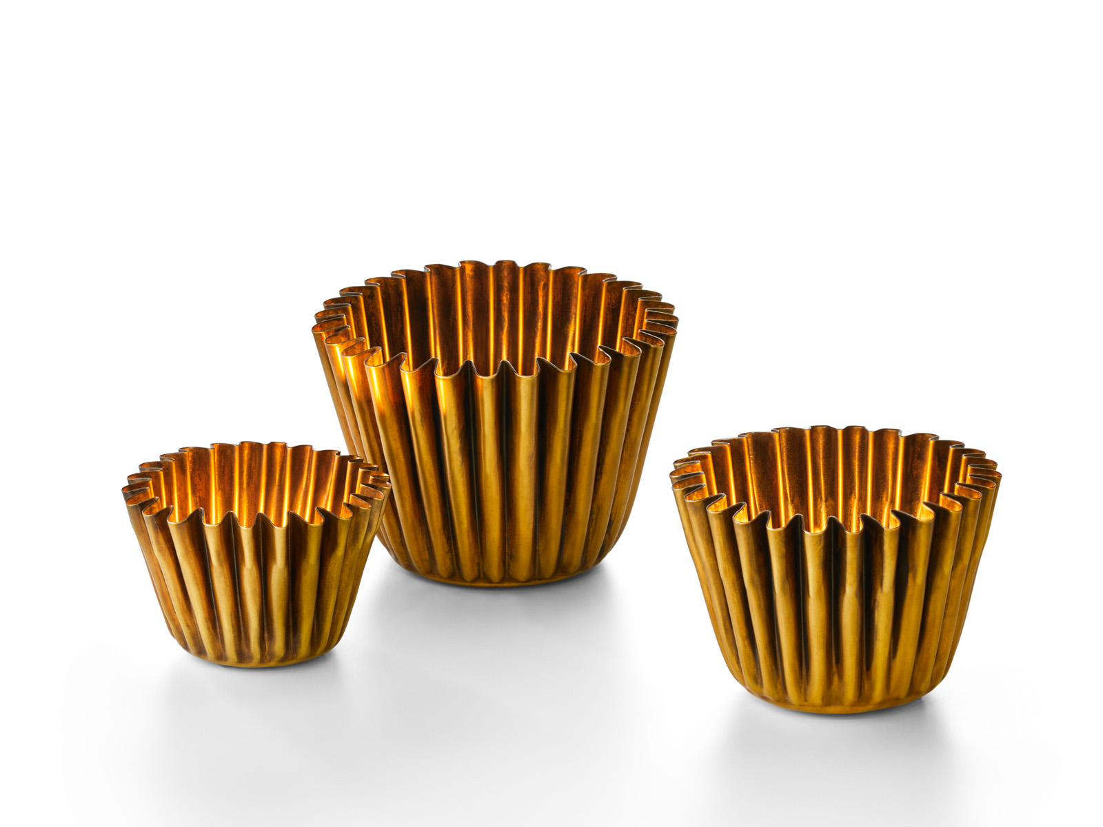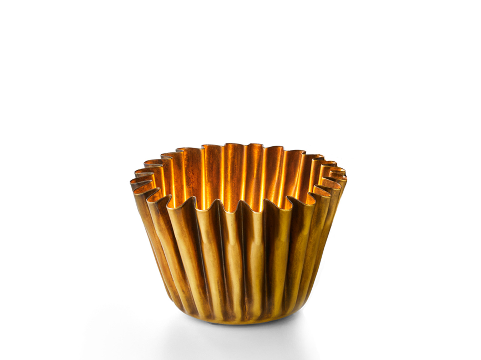 Świecznik o profilowanych pofalowanych bokach, wykonany z żelaza pokrytego lakierowanym antycznym mosiądzem.