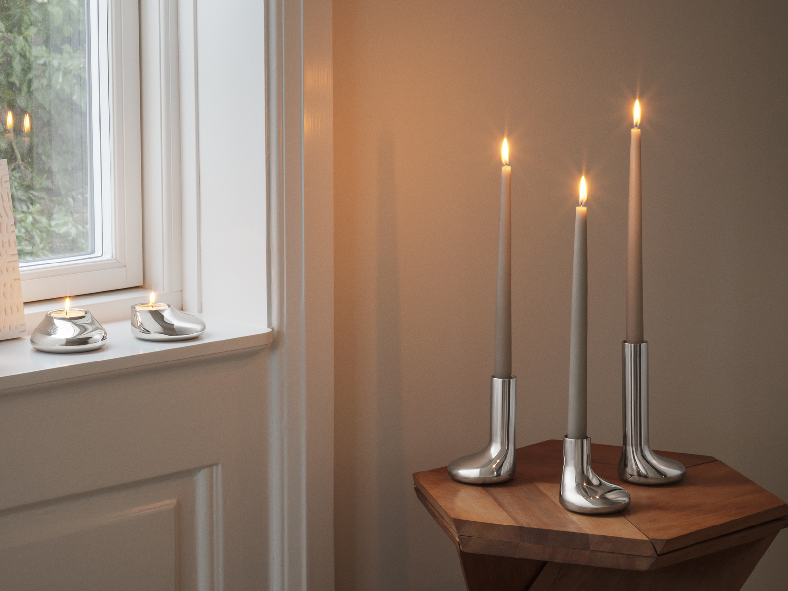 Kształt świecznika z owalną podstawą inspirowany jest spływającym ze świec rozgrzanym woskiem.