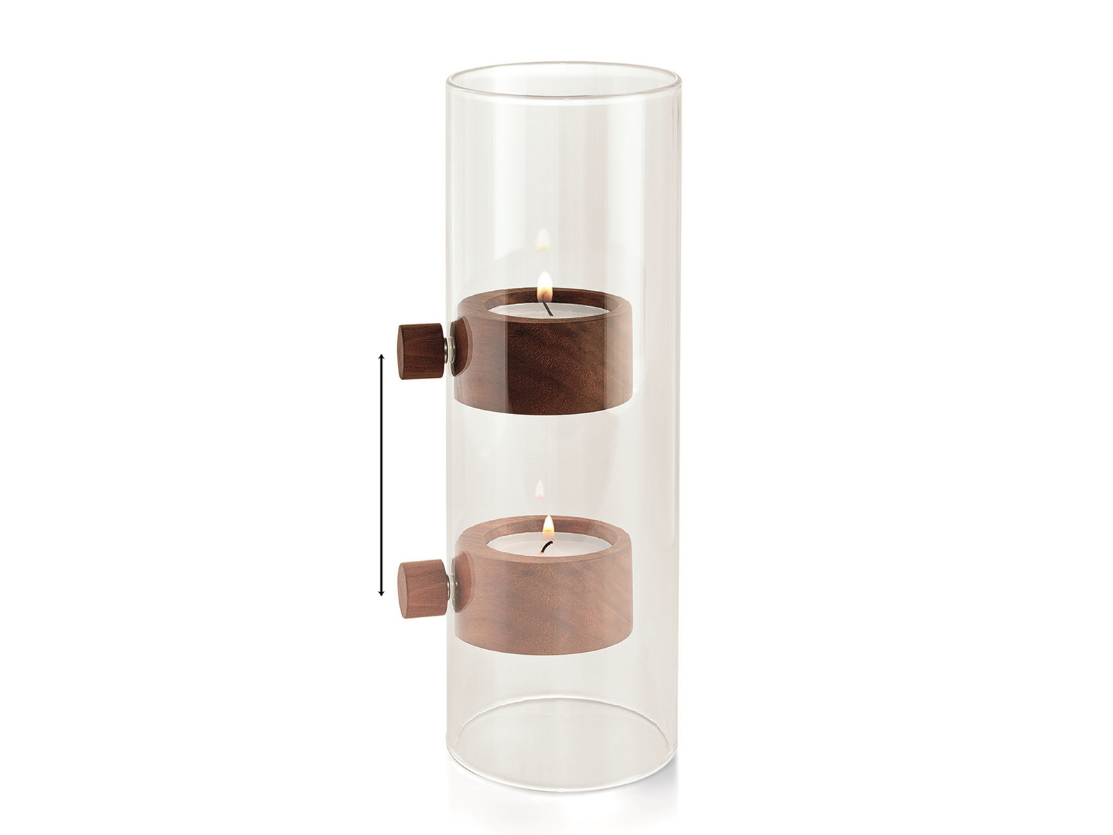 Podstawka ruchoma mocowana na szklanej ściance przez dwa osadzone w drewnie magnesy, które utrzymują podstawkę ze świeczką w pożądanej pozycji, a także umożliwiają regulację jej wysokości.