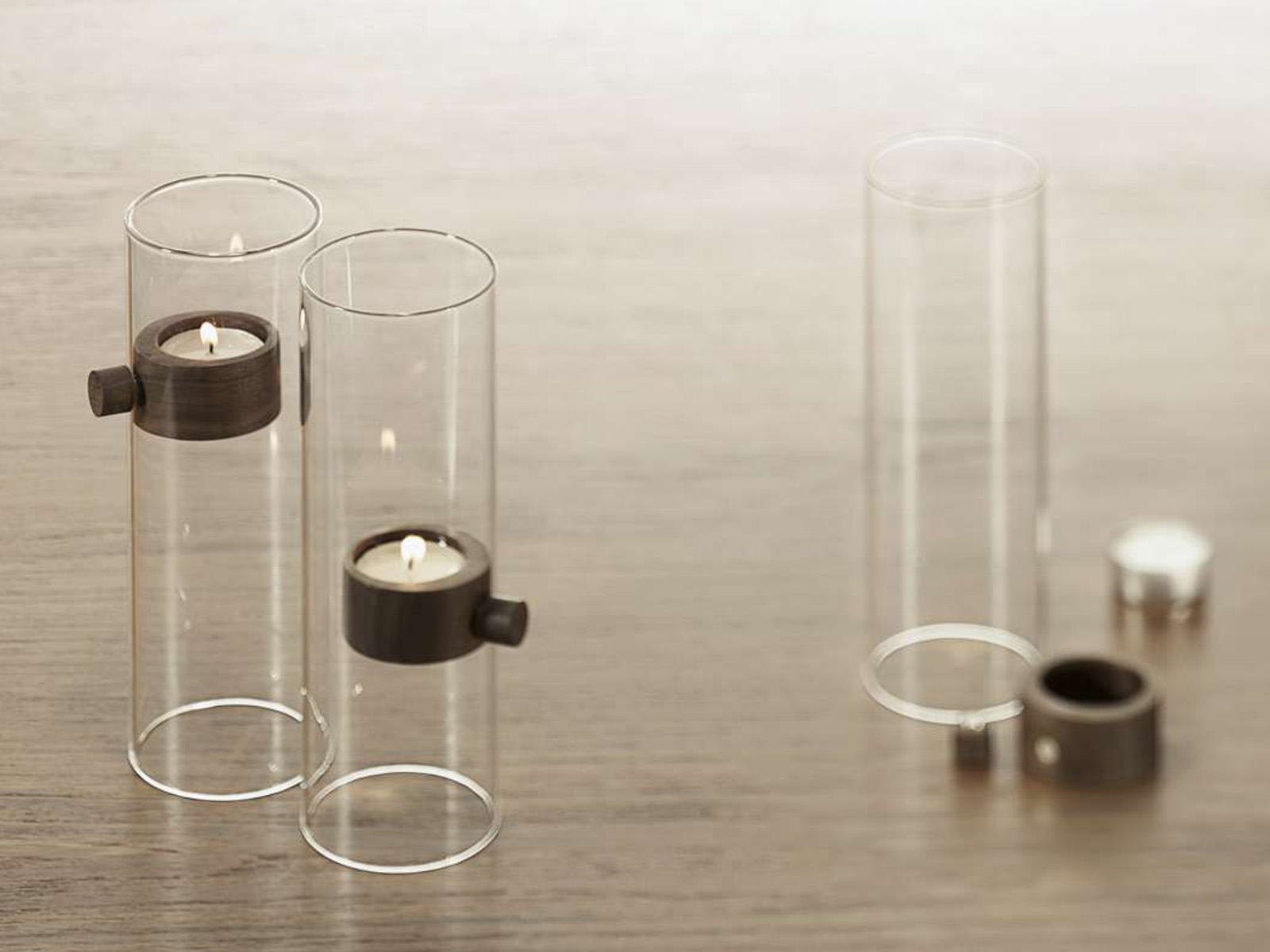 Konstrukcja świecznika wykonana z przezroczystego bezbarwnego szkła z okrągłą drewnianą podstawką na świece wykonaną z naturalnego drewna orzechowego.