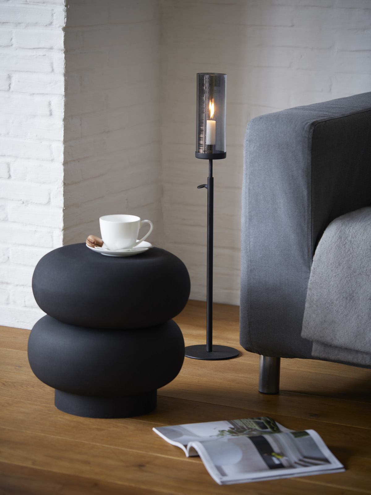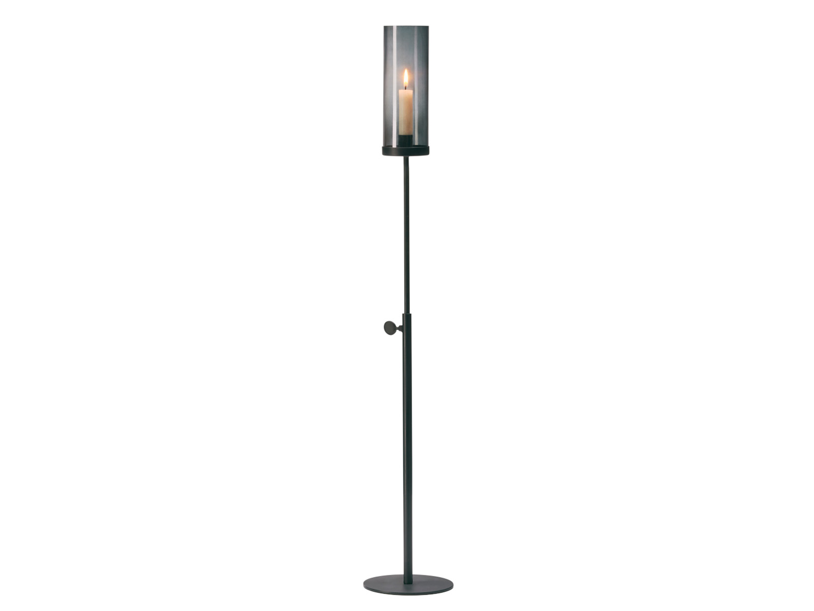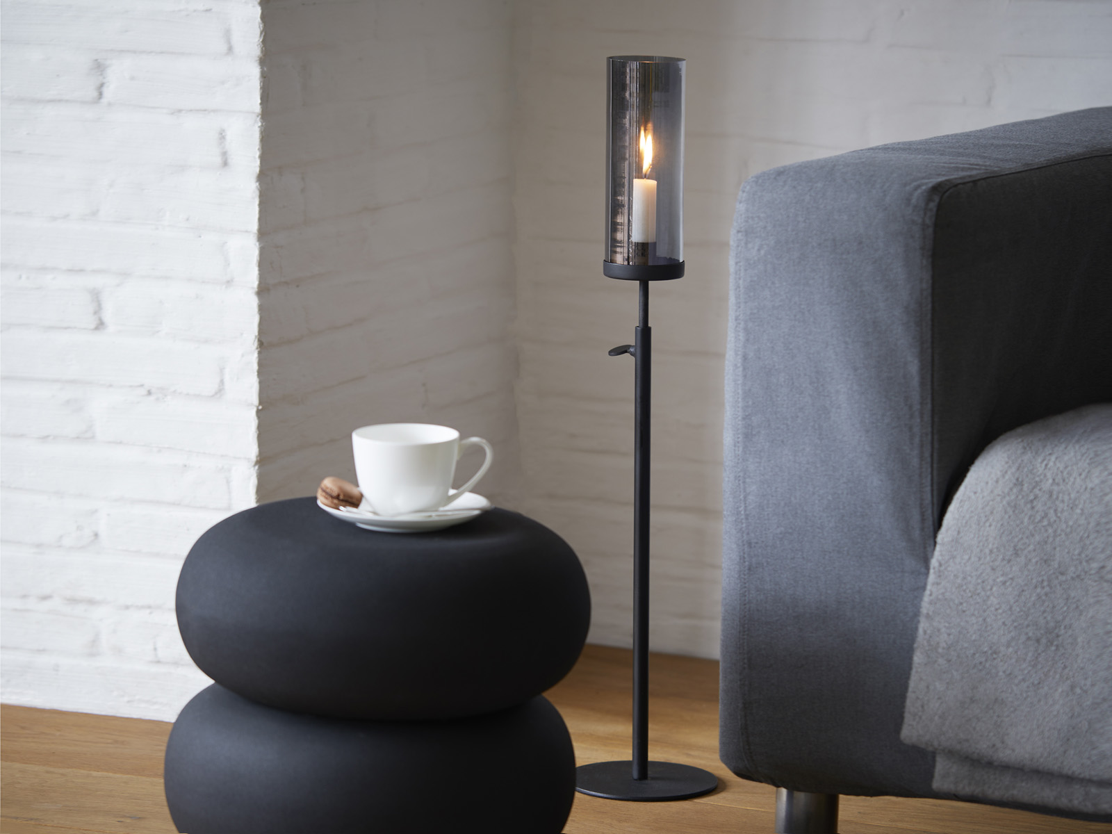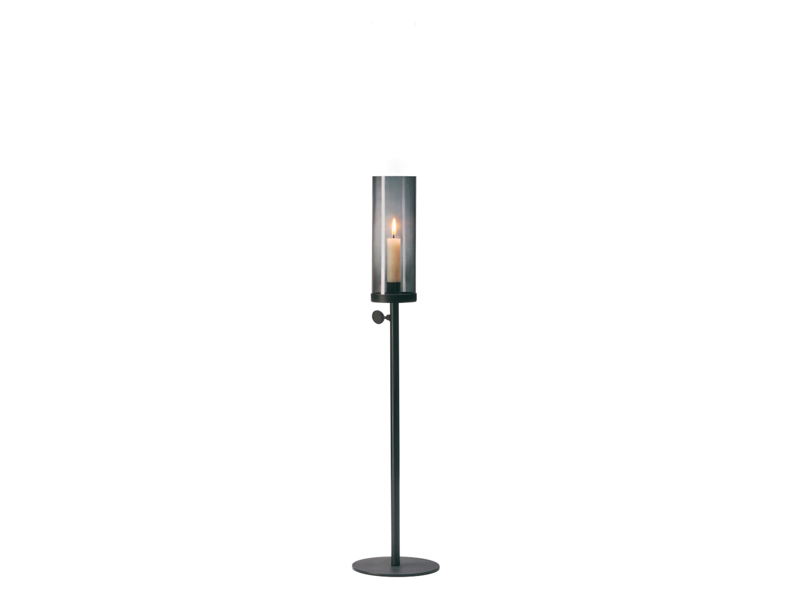 Świecznik z długą nóżka na okrągłej podstawie wykonany ze stali malowanej proszkowo oraz cylindrycznym kloszem na pojedynczą świece z wytrzymałego lekko przyciemnianego szkła borokrzemowego.