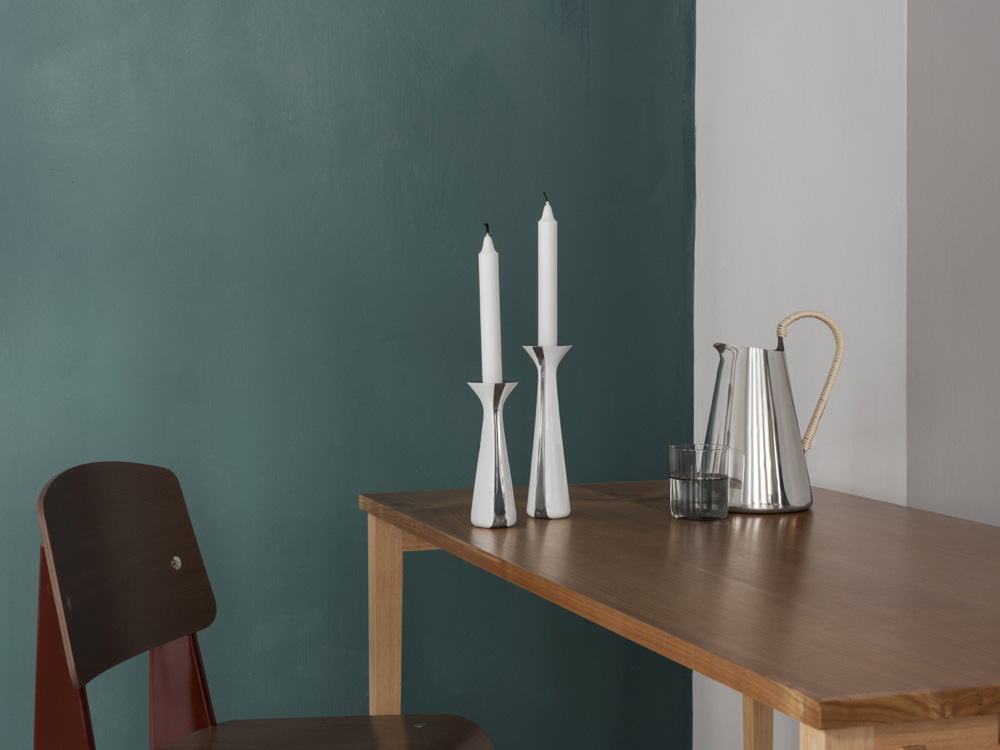 Świecznik wykonany z aluminium pokrytym białą szkliwioną emalią i wstawką z polerowanej na wysoki połysk stali nierdzewnej.
