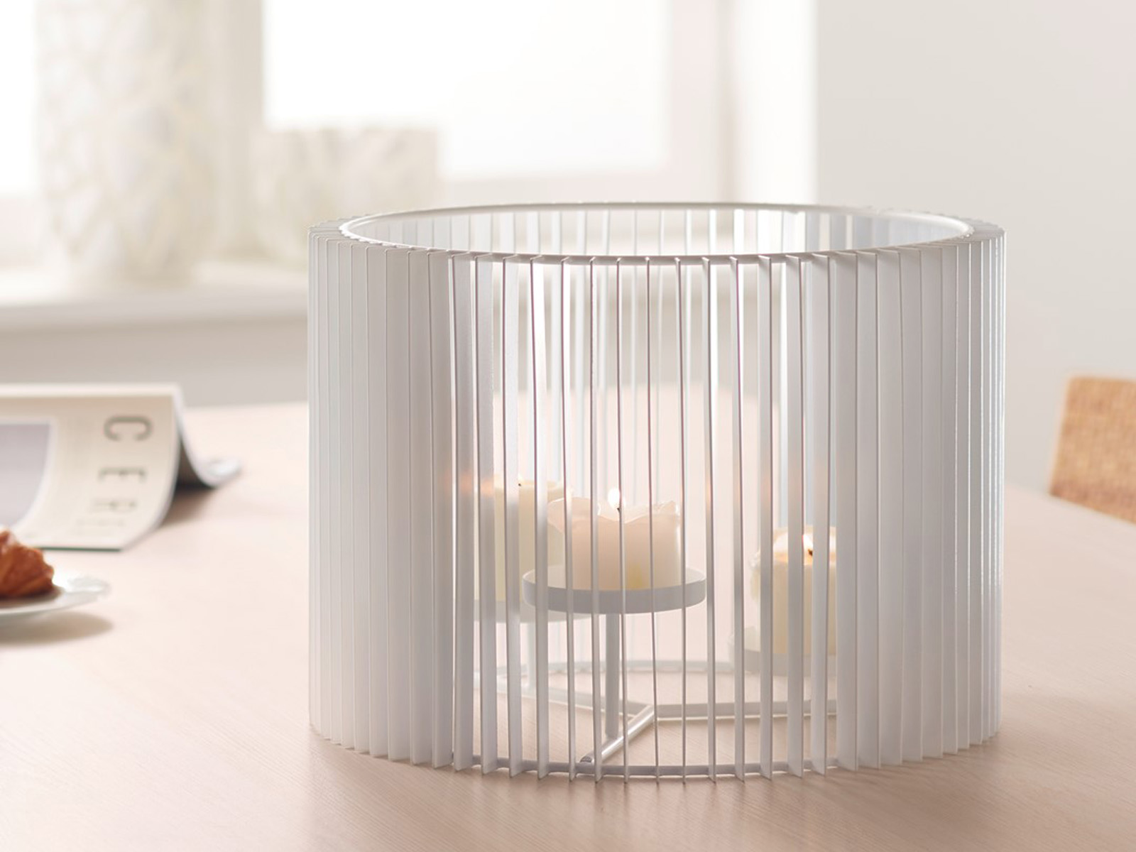 Elegancki duży dekoracyjny świecznik z okrągłym kloszem o ażurowej pionowej strukturze 70-dziesięciu wąskich listw pięknie rozpraszającej światło migoczących świec.