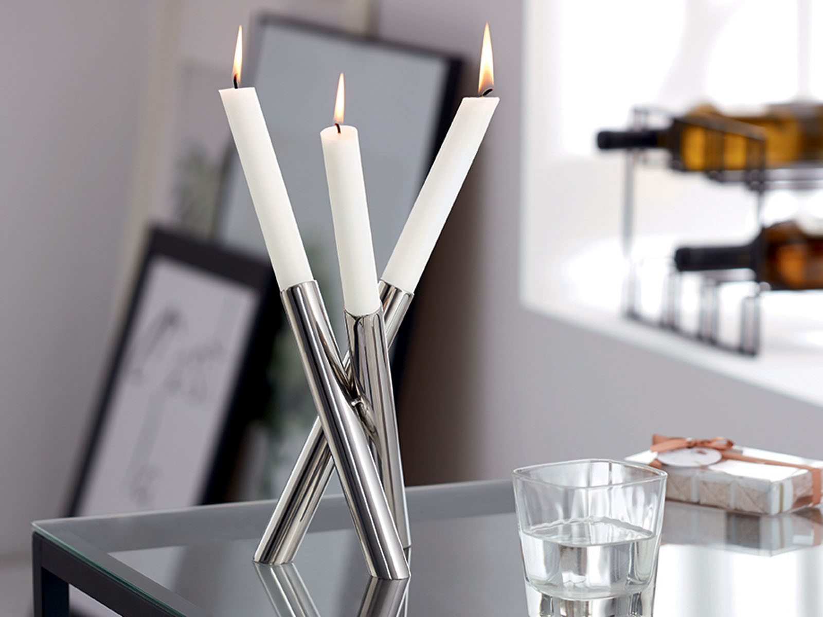 Świecznik wykonany jest z polerowanej stali nierdzewnej, a jego konstrukcja składa się z 3 rurkowatych ramion ustawionych i połączonych pod kątem.
