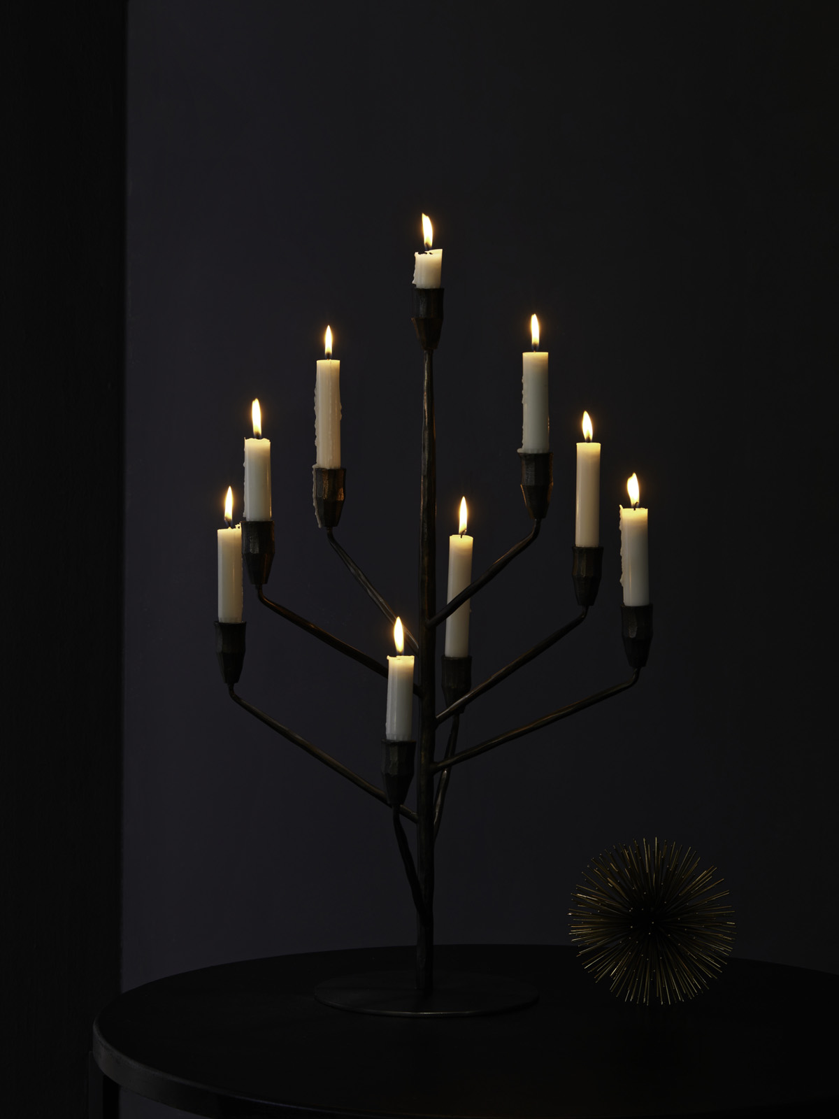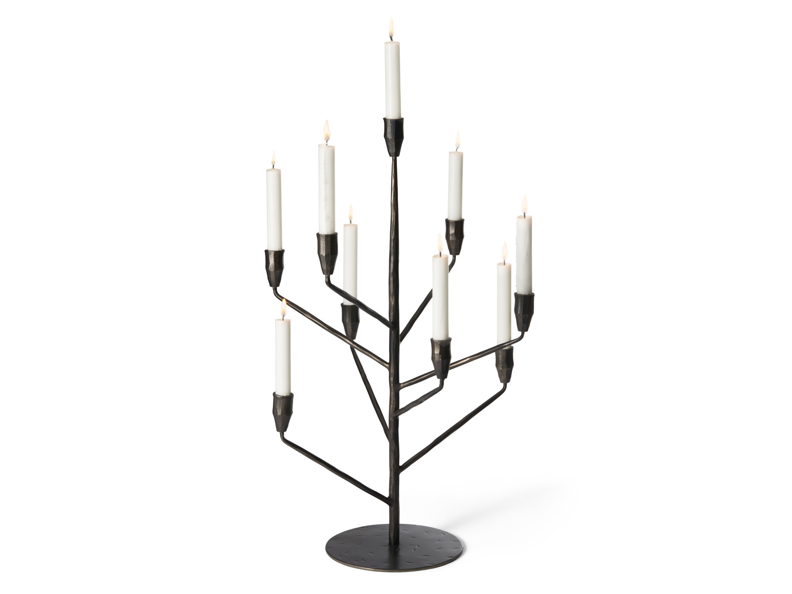 Świecznik z 9 -oma ramionami ustawionymi na różnych wysokościach przeznaczony na świece długie, wykonany z malowanego aluminium i stali.