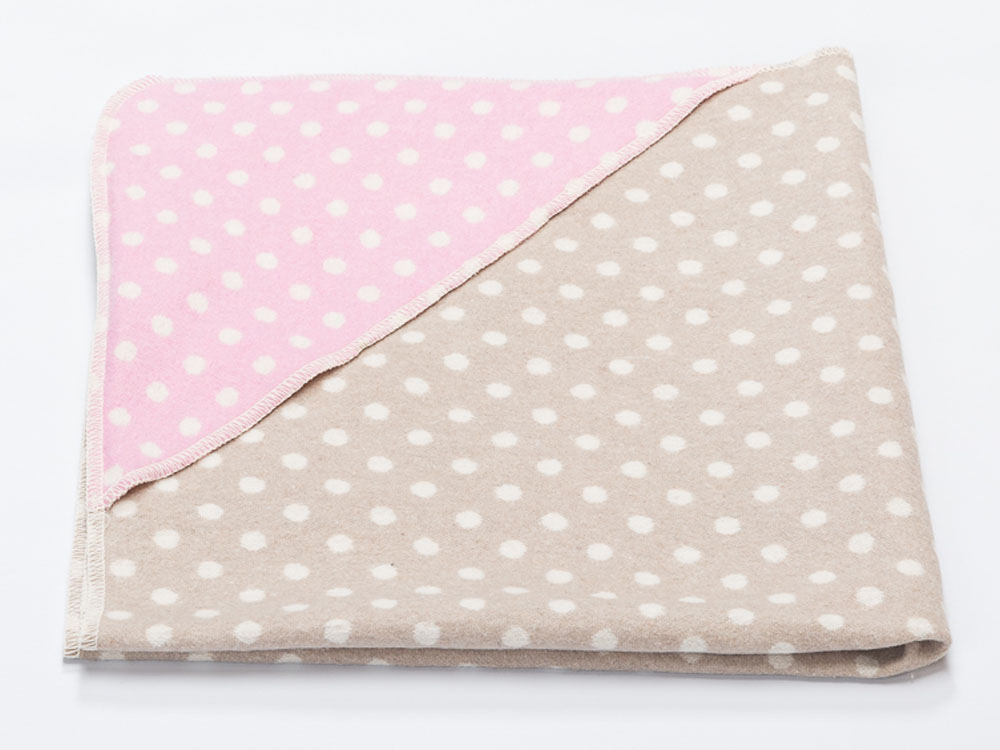 Oryginalny lekki, raczej cieńszy dziecięcy kocyk ze wzorem w kropki wykonany z bawełny z minimalną 5% domieszką naturalnej wiskozy. Kocyk posiada kapturek, które dodatkowo ochrania główkę dziecka przed chłodem. Kolory wzoru i tła na obu stronach kocyka umieszczone są na zasadzie "negatywu".