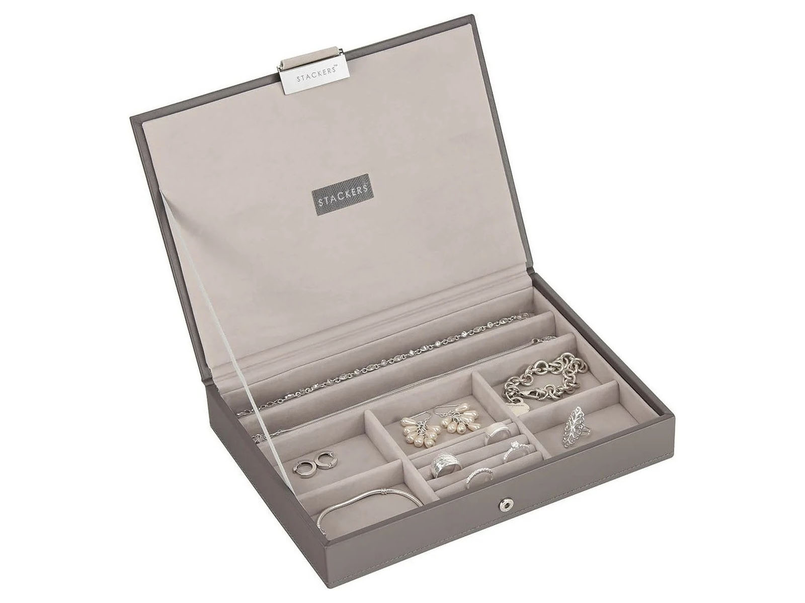 Szkatułka Stackers Classic to elegancka szkatułka idealna do przechowywania i zorganizowania podręcznej kolekcji biżuterii. Szkatułka posiada 8 przegródek do przechowywania każdego rodzaju biżuterii: bransoletek, naszyjników, pierścionków czy kolczyków.