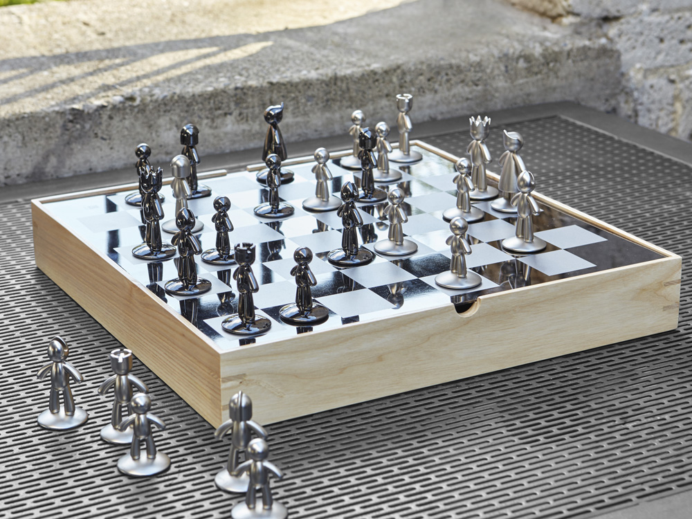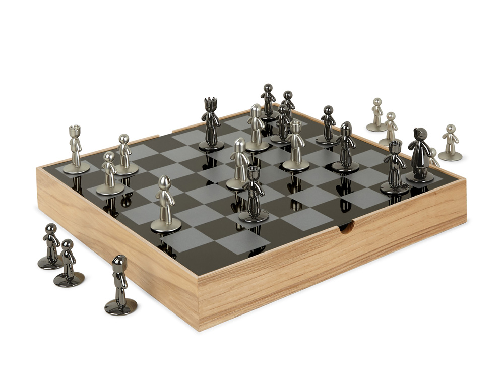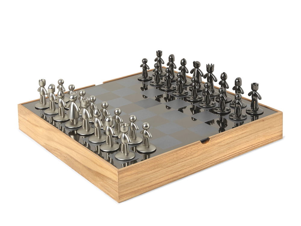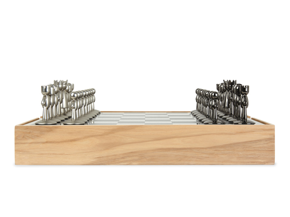 Oryginalny zestaw szachów z metalowymi figurami szachowymi w kształcie stojących postaci "ludzików".