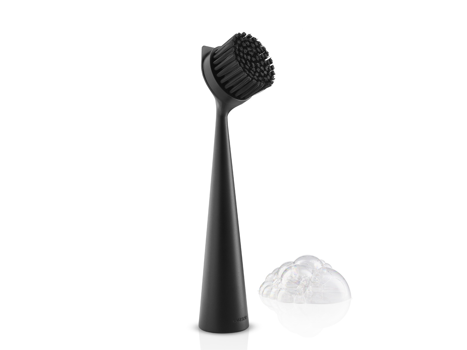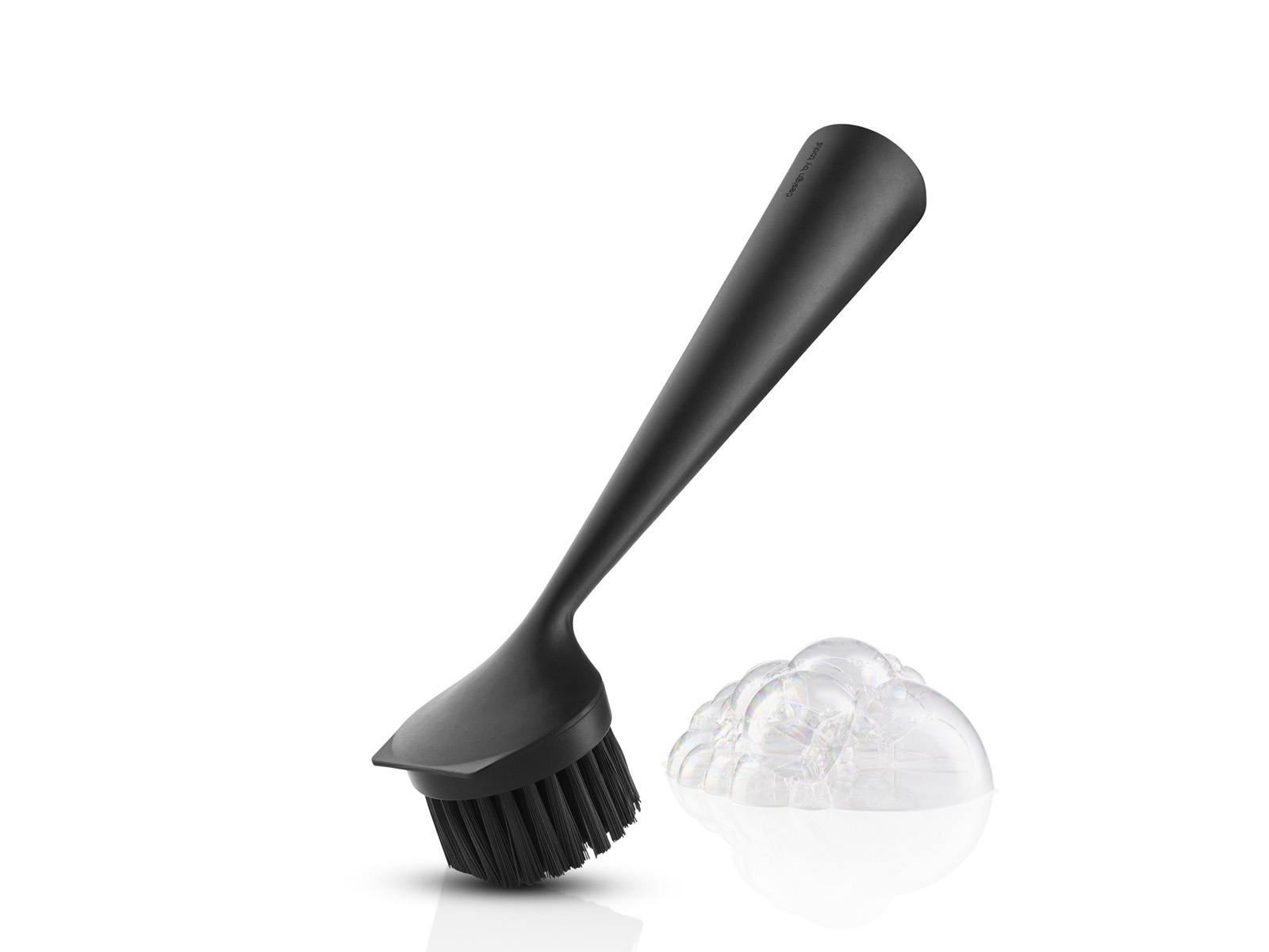 Długa stożkowata rączka szczotki wygodnie układa się w dłoni, a dzięki gkrągłęj szerokiej płaskiej podstawie i odpowiedniemu obciążeniu może stać stabilnie na blacie lub zlewie.