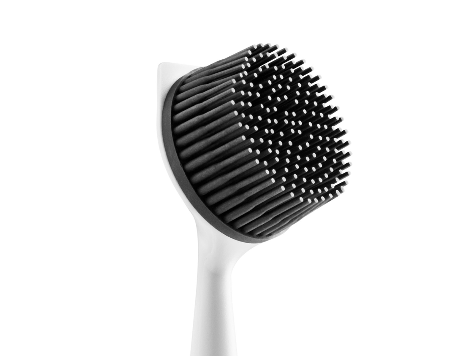 Długa stożkowata rączka szczotki wygodnie układa się w dłoni, a dzięki gkrągłęj szerokiej płaskiej podstawie i odpowiedniemu obciążeniu może stać stabilnie na blacie lub zlewie.