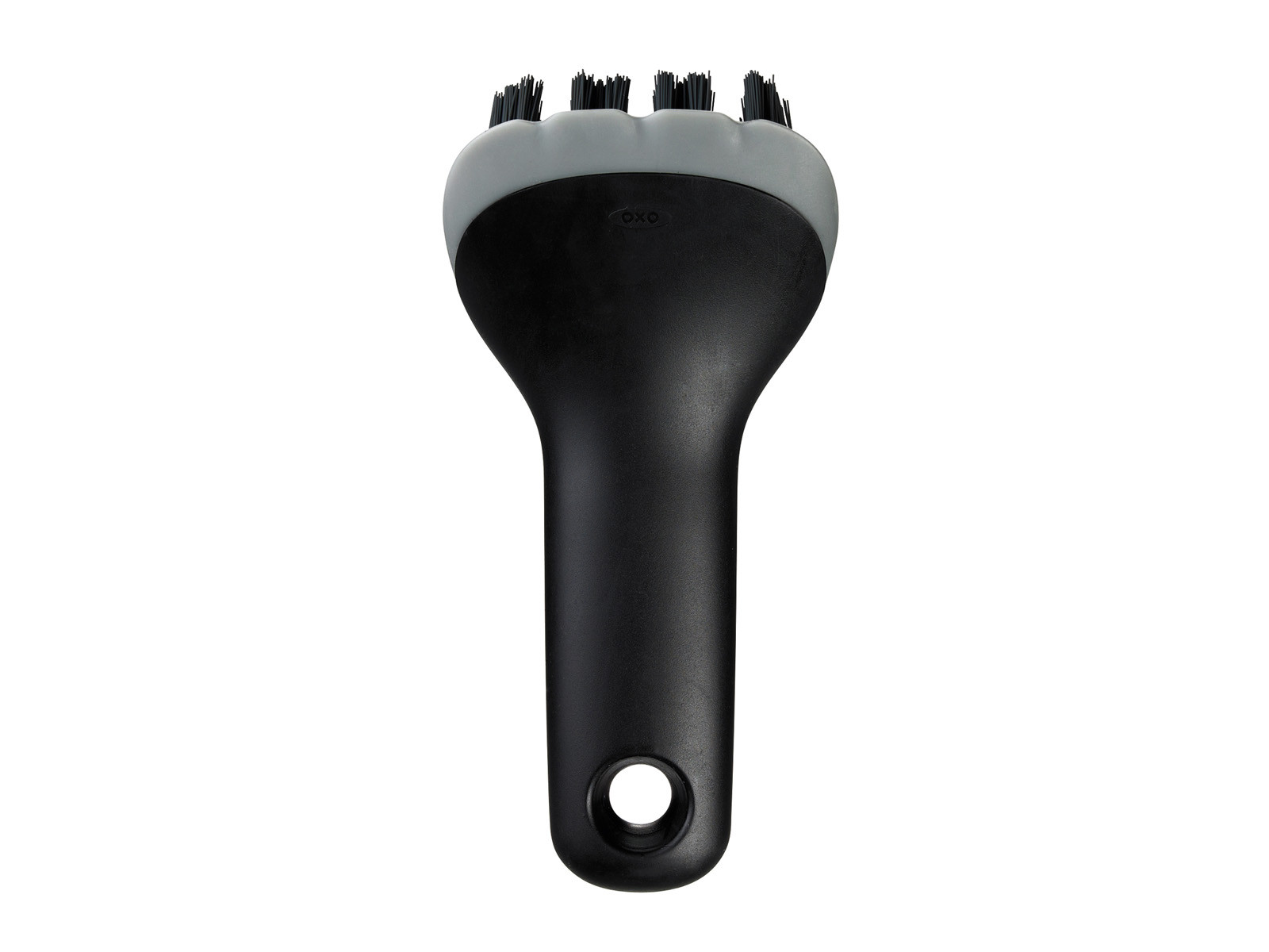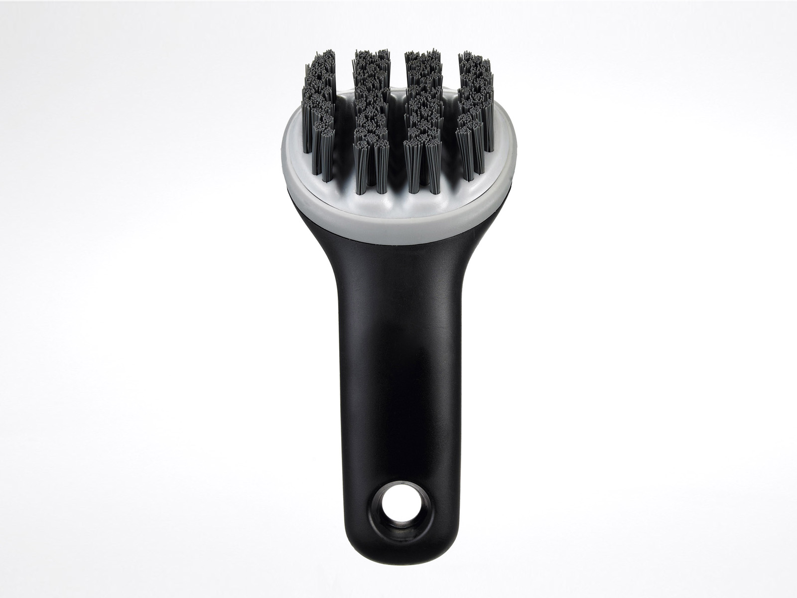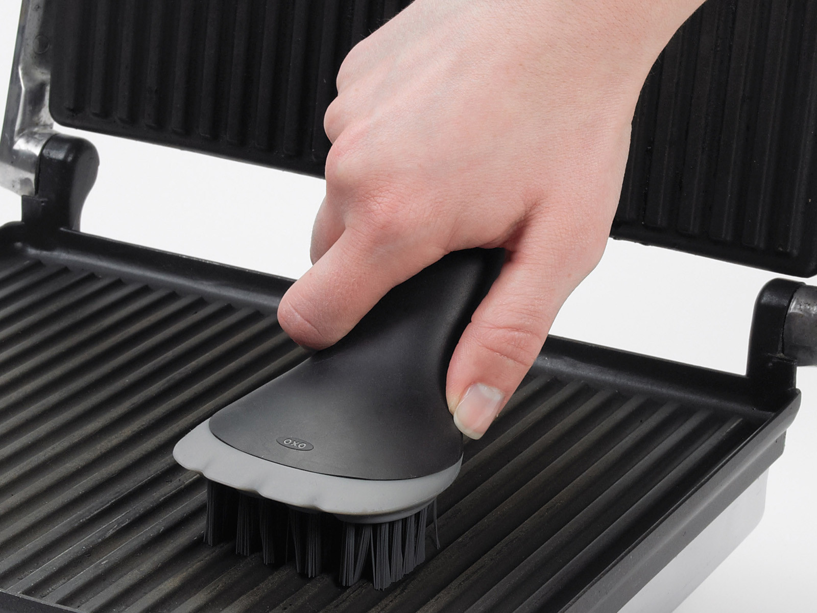 Na szczycie szczotki znajduje się szeroki lekko profilowany skrobak pokryty silikonem, który wymiecie i usunie okruszki oraz resztki żywności z wgłębień powierzchni grzewczej.