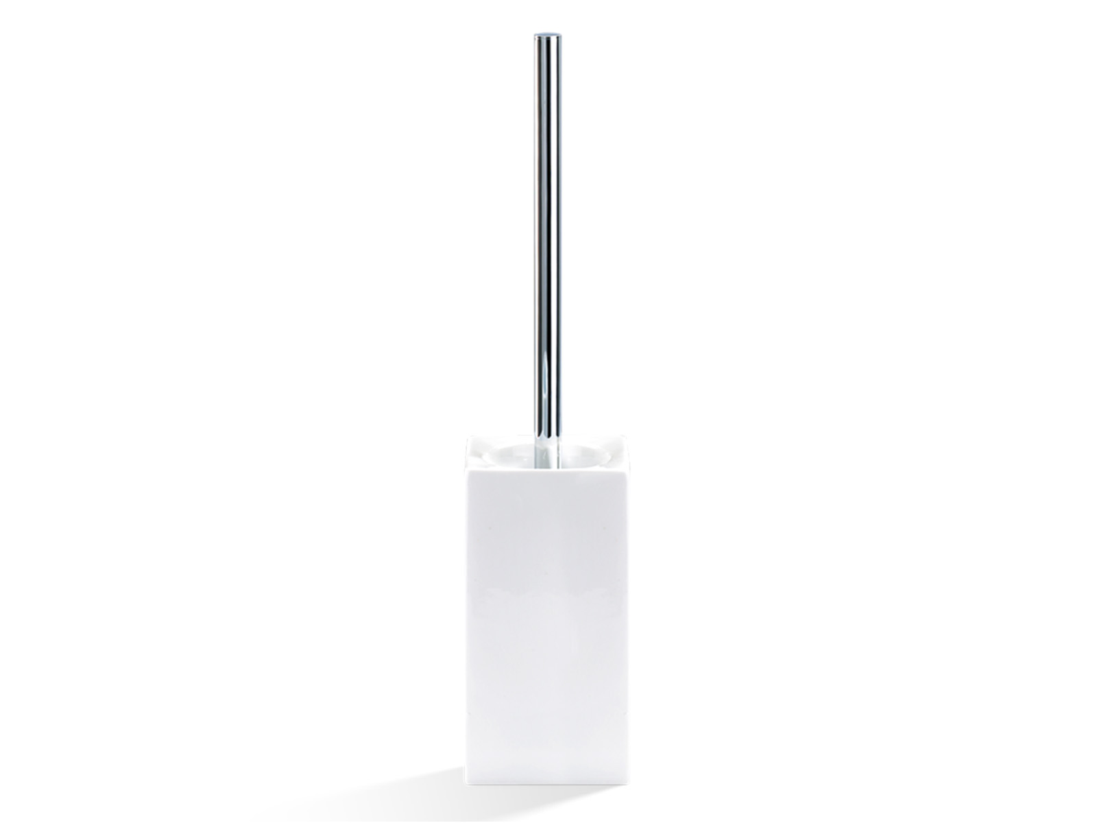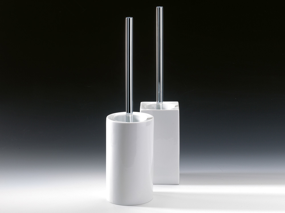 Elegancka wolnostojąca szczotka do toalety z prostokątnym wysokim odkrytym pojemnikiem wykonanym z białej gładkiej porcelany.