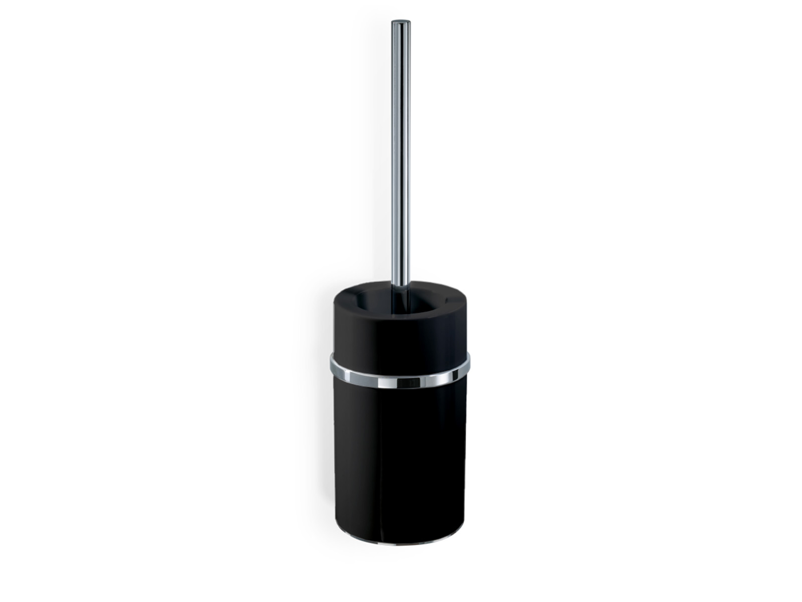 Pojemnik szczotki wykonany z czarnej porcelany, uchwyt szczotki, uchwyt i podstawa pojemnika wykonane z wysokiej jakości chromowanego mosiądzu.