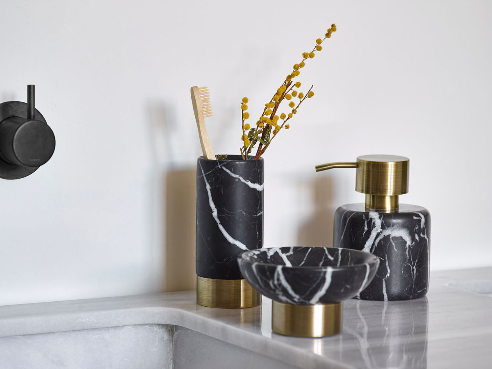 Kolekcja Nero charakteryzuje się bardzo prostym, a jednocześnie oryginalnym designem. Wykonana jest z naturalnego kamienia w ciemnoszarym kolorze z białymi żyłkami. Ciemny kamień jest wzbogacony elementami ze stali nierdzwnej w kolorze szczotkowanego mosiądzu. Połączenie kamienia z kolorem mosiądzu daje bardzo elegancki, oryginalny i dotąd rzadko osiągany efekt.