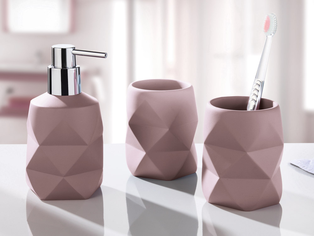 W kolekcji znajdują się dozownik, kubeczek oraz szczotka do WC.