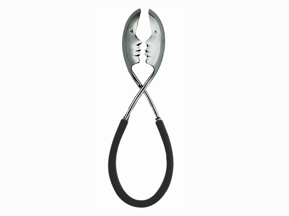 Eleganckie dekoracyjne metalowe szczypce do serwowania sałaty, warzyw i innych delikatnych potraw. Brzegi metalowych powierzchni chwytnych szczypiec w kształcie zbliżających się do pocałunku twarzy.