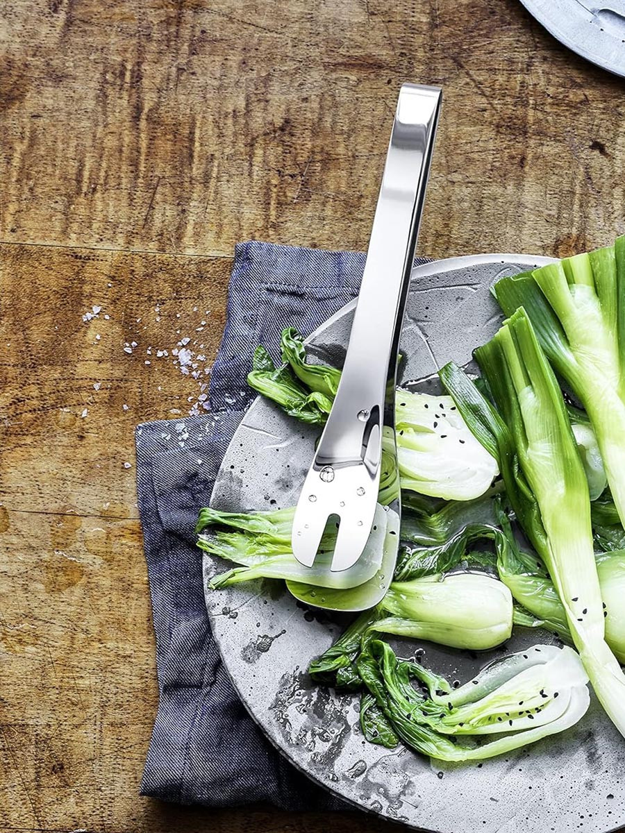 Szczeliny na bokach szczypiec umożliwiają odsączenie nadmiaru sosu lub soku z warzyw.