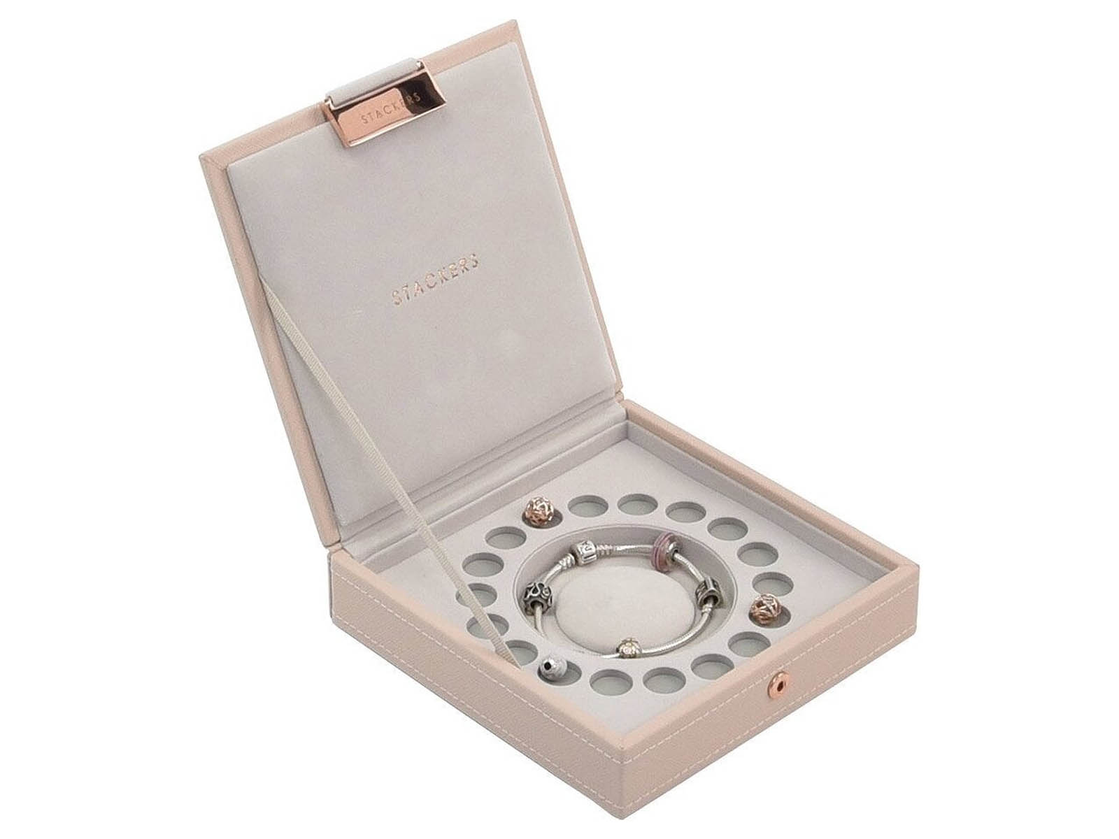 Szkatułka Stackers Charms to mała elegancka szkatułka idealna do przechowywania i zorganizowania bransoletek i charmsów. Szkatułka posiada przegródki do przechowywania, transportu i prezentacji bransoletek oraz 18 charmsów